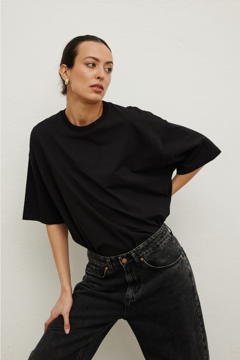 Fason o prostym, pudełkowym kroju z lekko obniżoną linią ramion. Rękaw szeroki, przedłużony. Dekolt niewielki, okrągły wykończony ściągaczem. Przód koszulki posiada ozdobny haft z napisem BE REAL, NOT PERFECT w tym samym kolorze. Luźna, inspirowana męską garderobą koszulka, która pasuje niemalże do każdego typu sylwetki - świetnie tuszuje wszelkie niedoskonałości i daje możliwość noszenia zarówno w luźnej formie, jak i delikatnie wpuszczonej do spodni, czy spodenek. Gwarantuje komfort i stylowy wygląd.