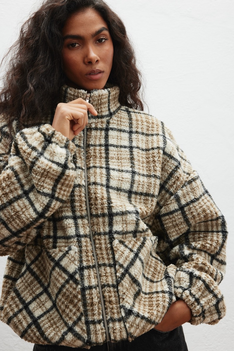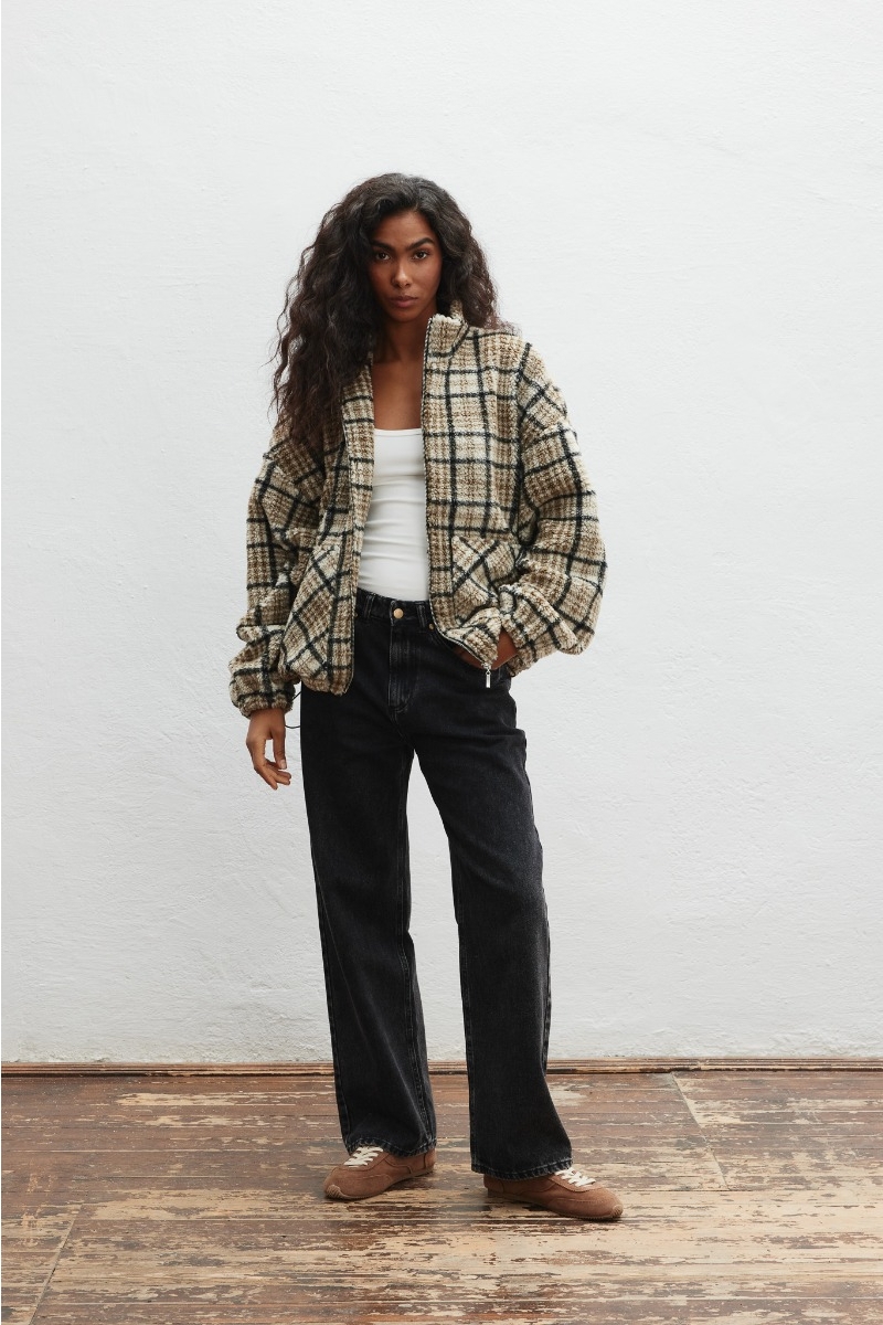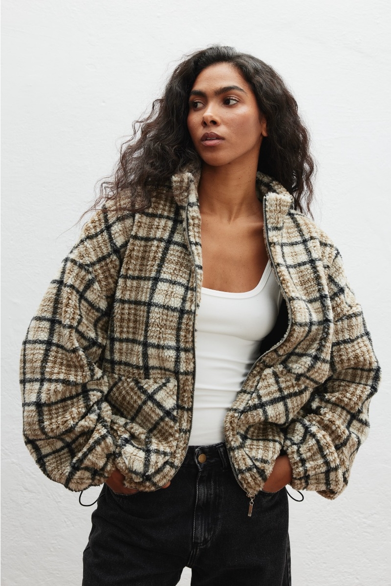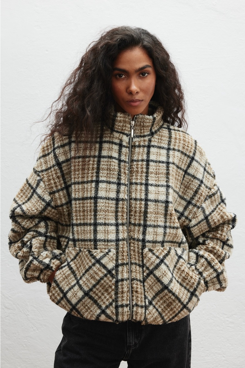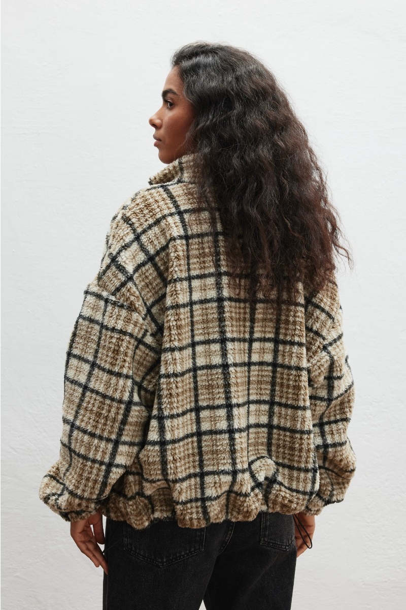 Bluza wykonana z tkaniny typu "baranek " w kratę, w kolorze beżowo czarnym.