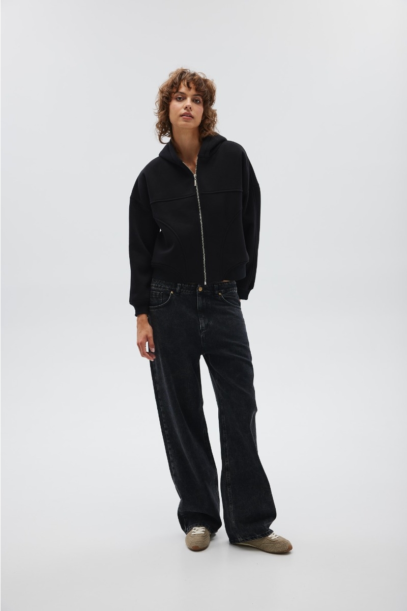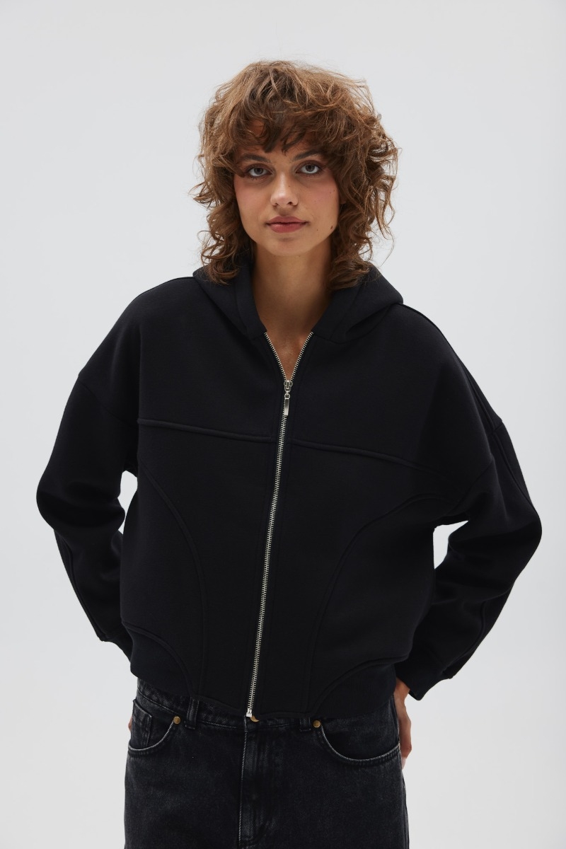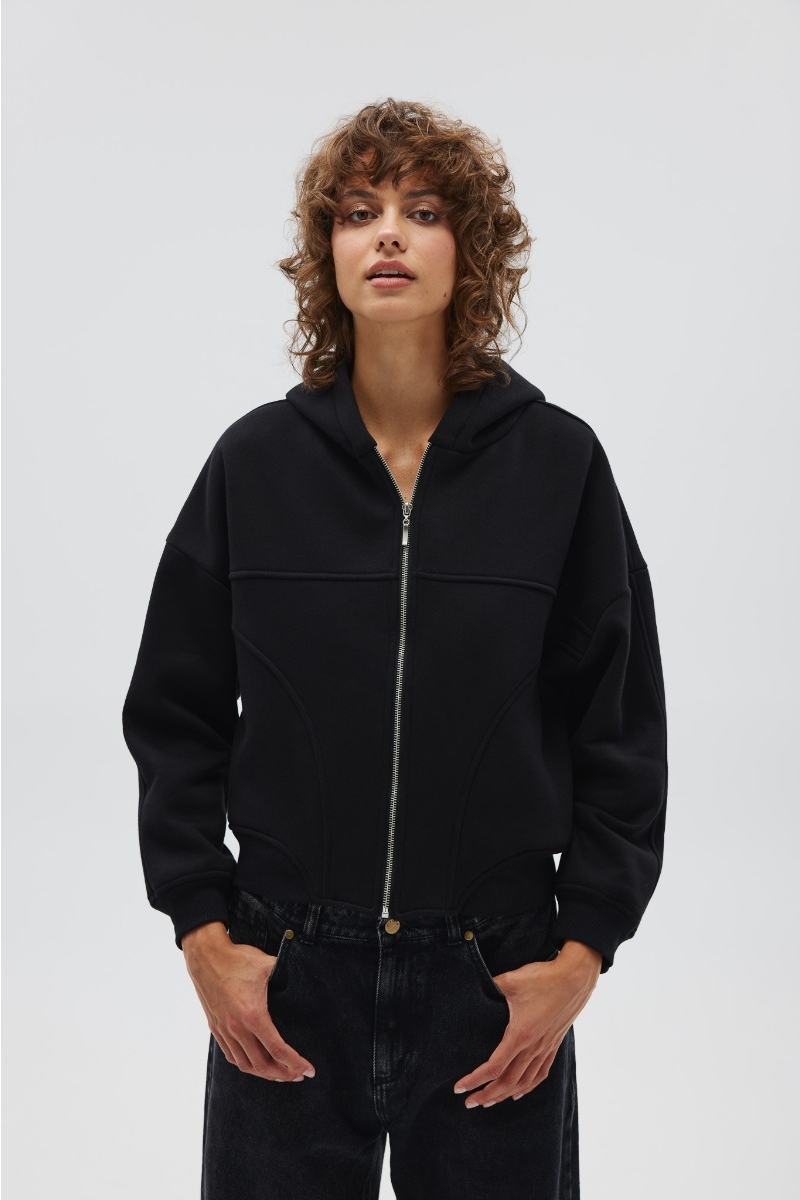 Model, w którym wygoda sportowej bluzy zamknięta została w oryginalnej formie. Całość zapinana na zamek błyskawiczny, mankiety oraz dół bluzy wykończony ściągaczem. W bocznych szwach zostały umieszczone kieszenie. Bluza z przodu oraz z tyłu posiada przeszycia. Nie banalna forma o pudełkowym kroju. Świetnie łączy się zarówno z jeansem, jak i bielą, czy czernią. Pozwoli stworzyć wiele uniwersalnych i ponadczasowych stylizacji.