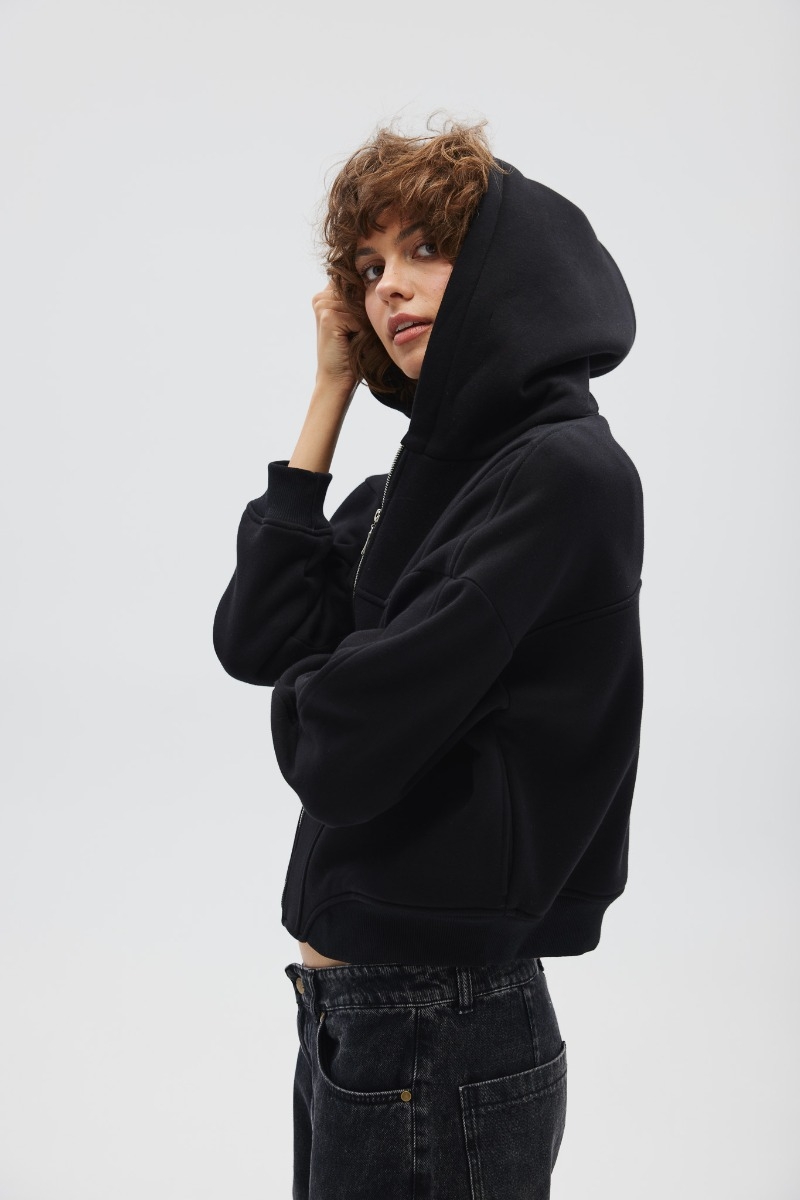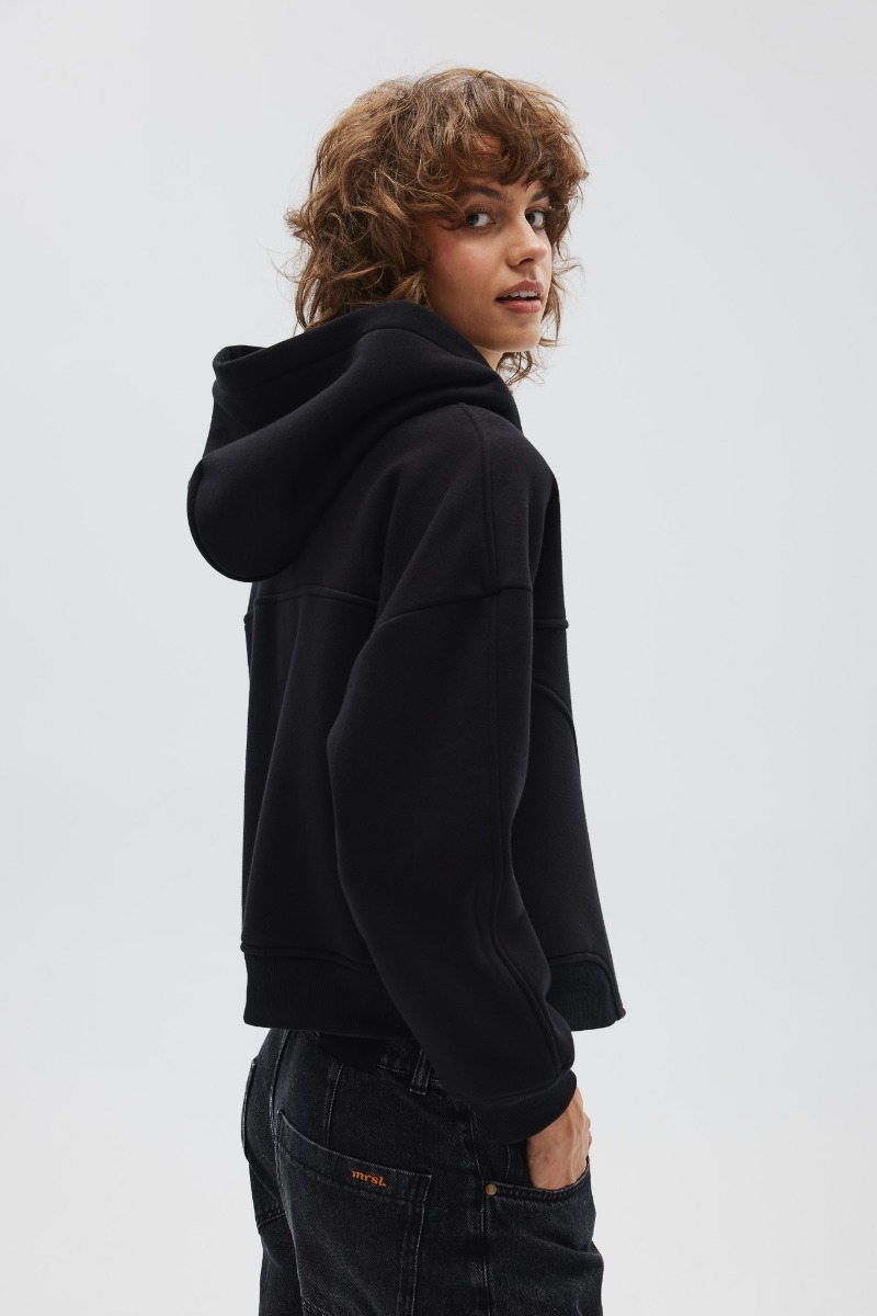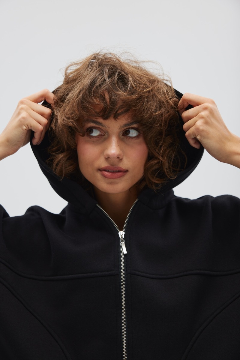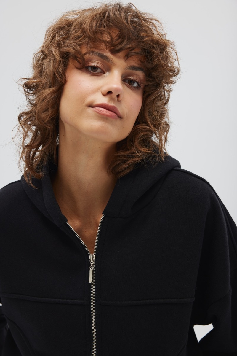 Bluza damska z kapturem, wykonana z ocieplonej dzianiny w kolorze czarnym.