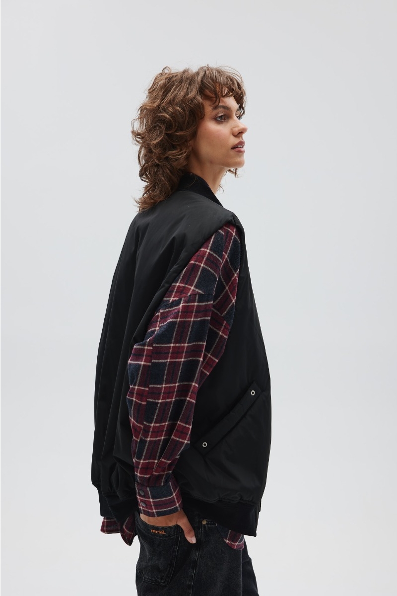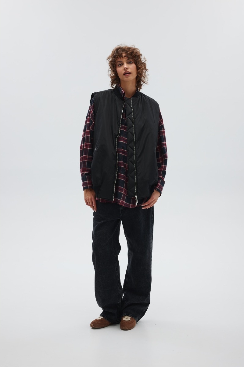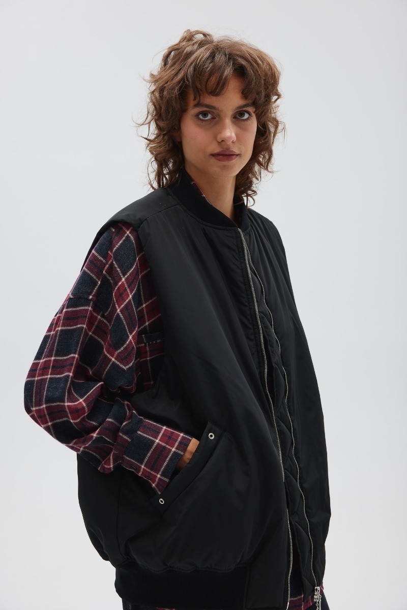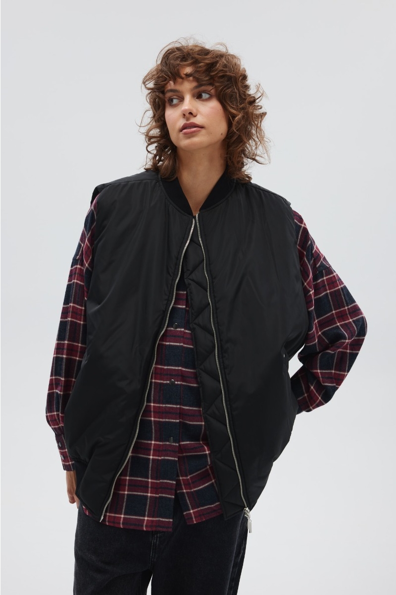 Model o klasycznym nieco wydłużonym kroju z ociepleniem. Kołnierz oraz dół kamizelki został wykończony bawełnianym ściągaczem. Całość zapinana na zamek, po bokach dwie kieszenie z ozdobnymi srebrnymi oczkami. Tył zupełnie gładki z oczkami w górnej części.