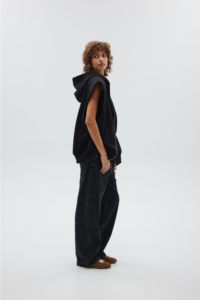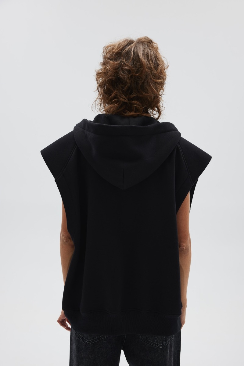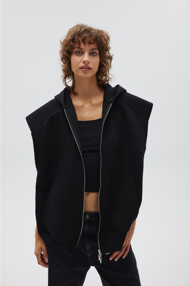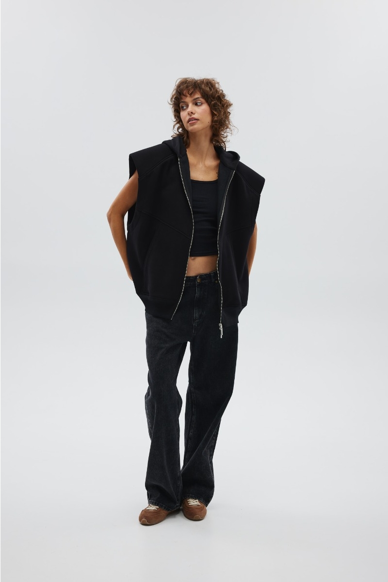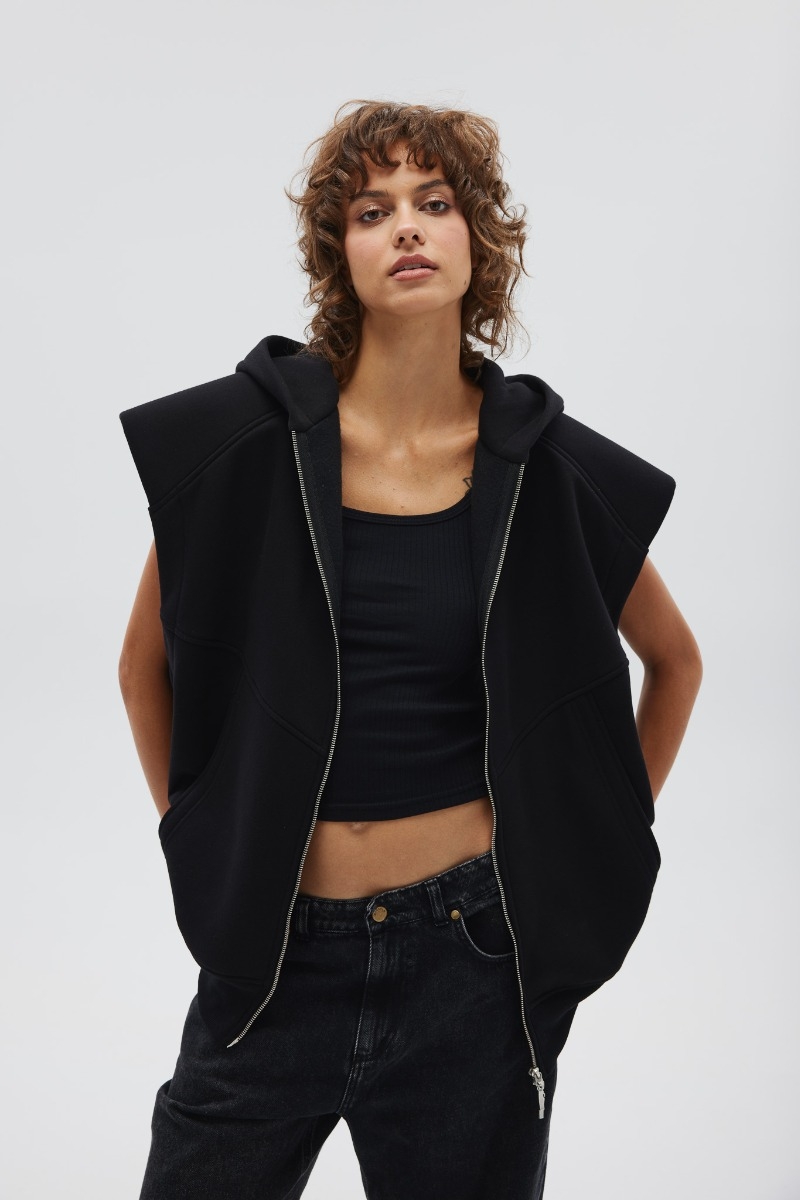 Stylowa i oversizowa forma w kobiecym wydaniu. Model z kapturem, zapinany na zamek błyskawiczny. Z przodu dwie kieszenie, oraz charakterystyczne przeszycia. Dół wykończony ściagaczem. Kamizelka wykonana jest z ocieplonej bawełny która świetnie trzyma formę. Idelana propozycja na sezon przejściowy oraz na chłodniejsze dni. Świetnie komponuje się z legginsami, spodniami jeansowymi lub joggerami. Idealny element do budowania warstwowego looku. Minimalistyczny design idealny do casualowej garderoby.