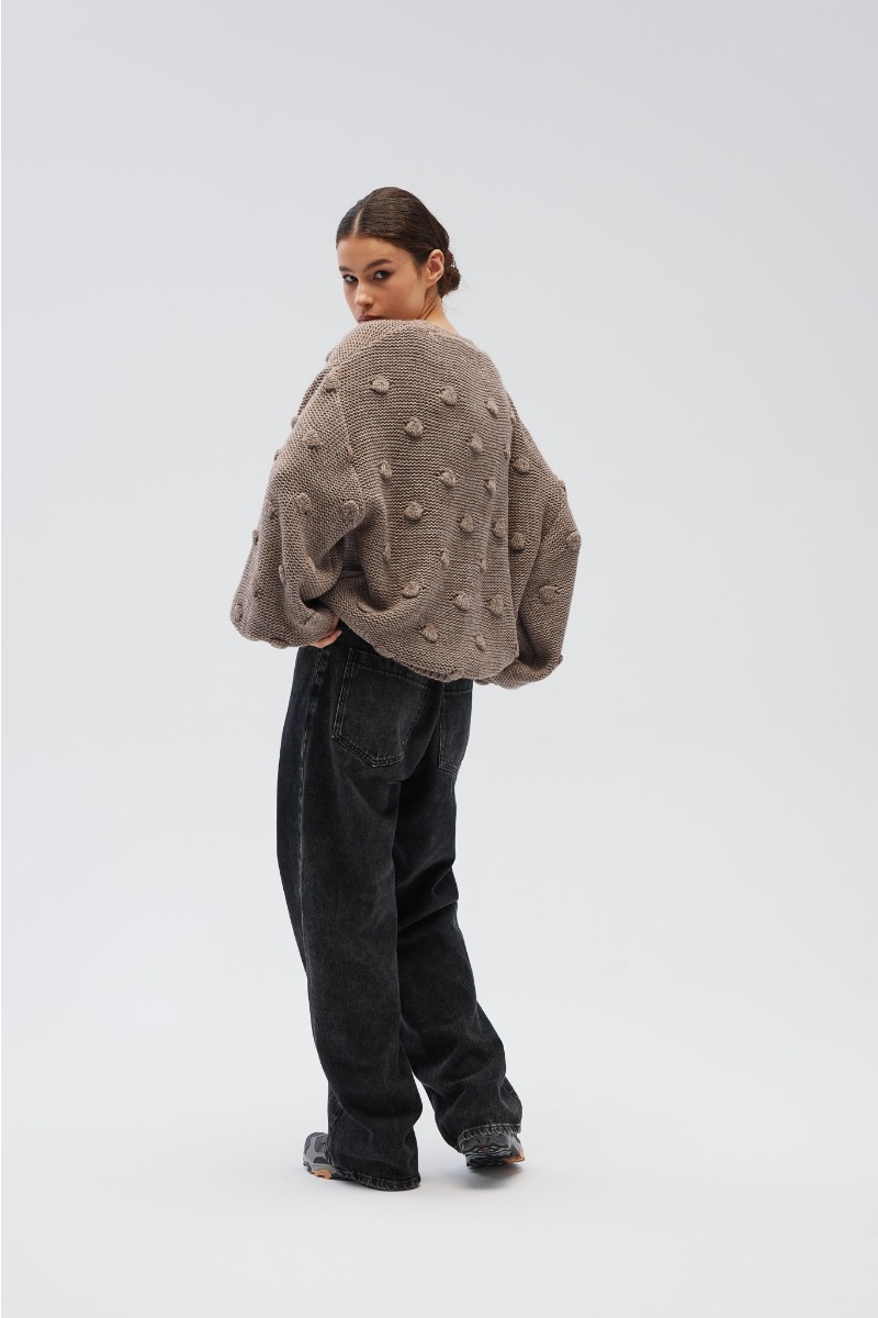 Unikalny sweter wykonany z miękkiej przędzy w kolorze brązowym. Klasyczny krój z dekoltem w serek, zapinany na guziki, bufiaste rękawy. To co go wyróznia to unikalne " bąbelki " umieszczone na całości modelu. Niezwykle uniwersalny model, świetnie sprawdzi się w codziennych stylizacjach. To co go wyróznia to unikalne " bąbelki " umieszczone na całości modelu. Idalnie pasuje do klasycznych białych Tshirtów oraz jeansów. Do pracy połącz go z cygaretkami oraz białą koszulą.