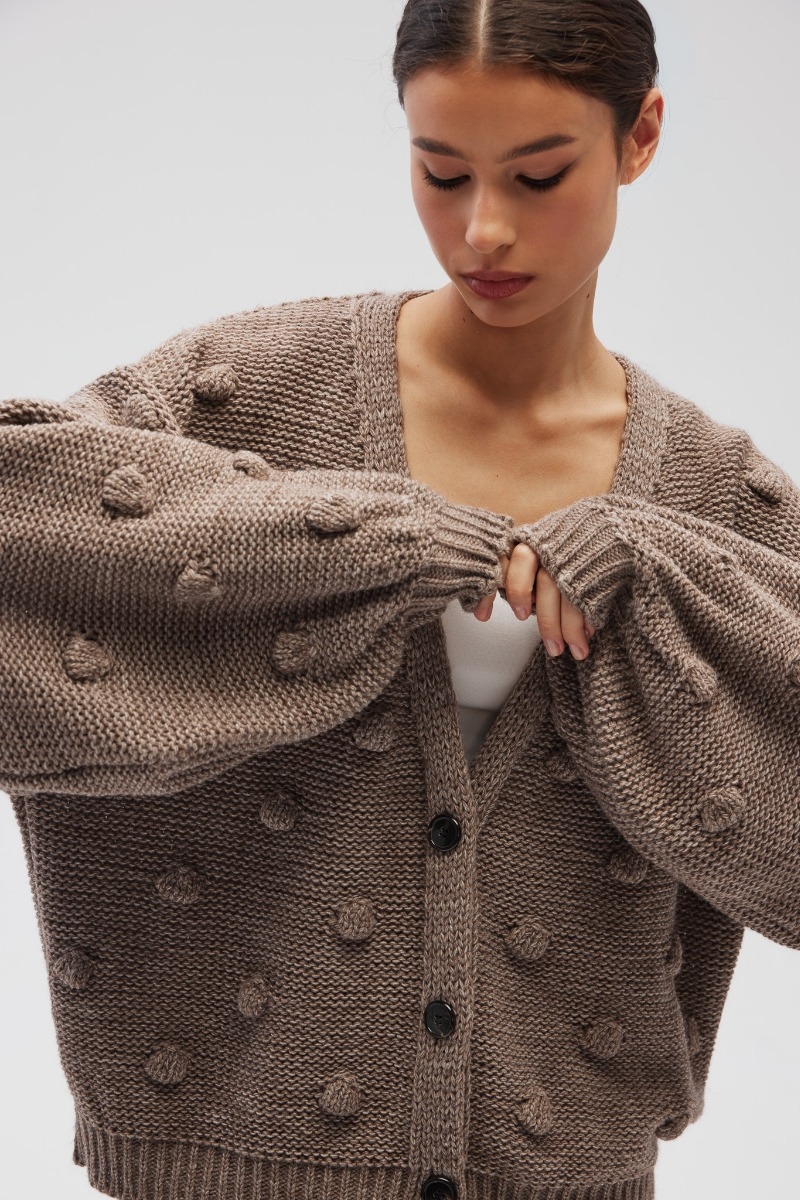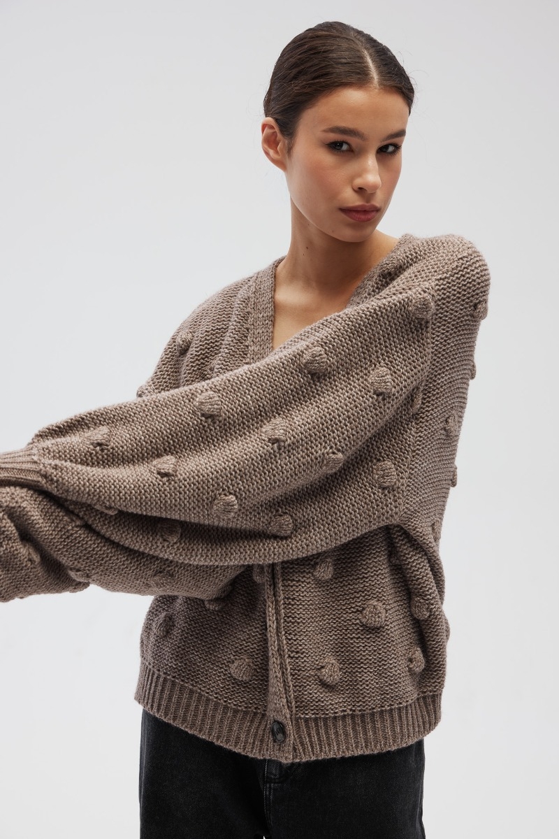 Wełniany kardigan z bąbelkowym splotem- styl i komfort w jednym.