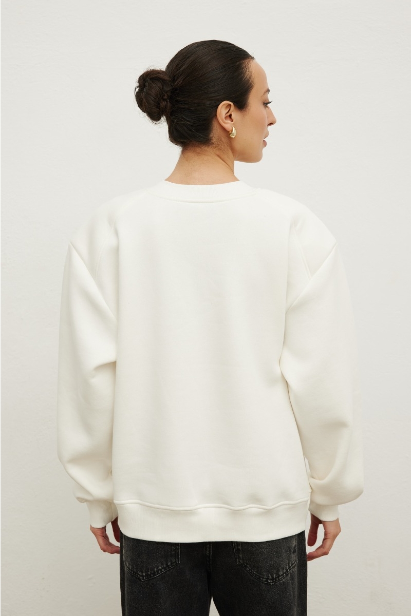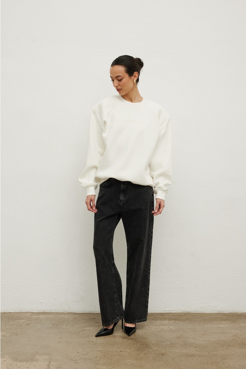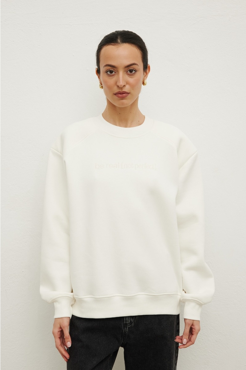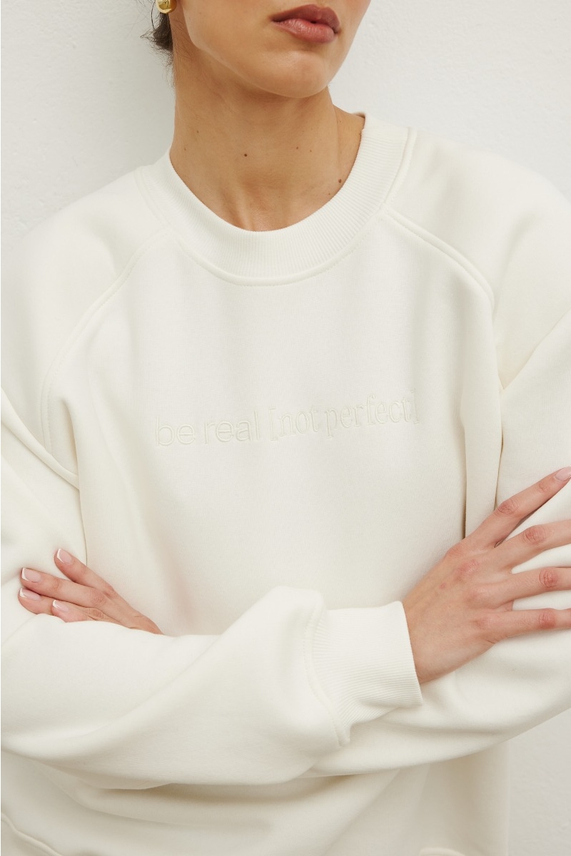 Na przodzie znajduje się haft w kolorze bluzy z motywującym napisem „Be real not perfect”, który dodaje jej charakteru, zachowując minimalistyczny styl. W ramionach wszyto specjalne wzmocnienia subtelnie budujące linię ramion i podkreślające ich kształt. Tył pozostaje całkowicie gładki.