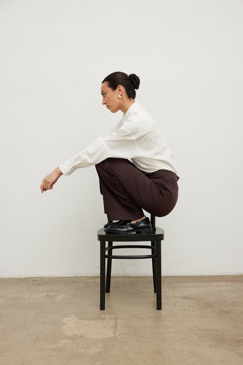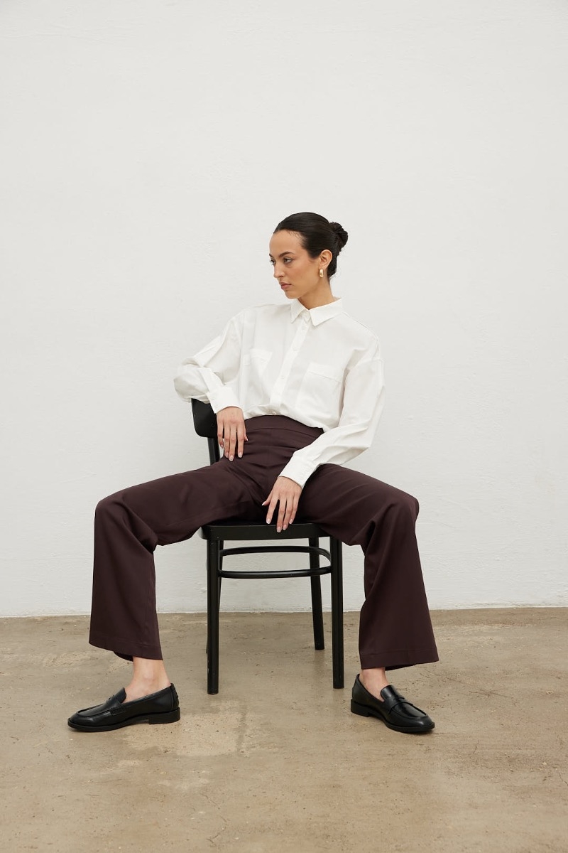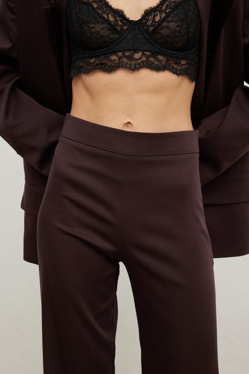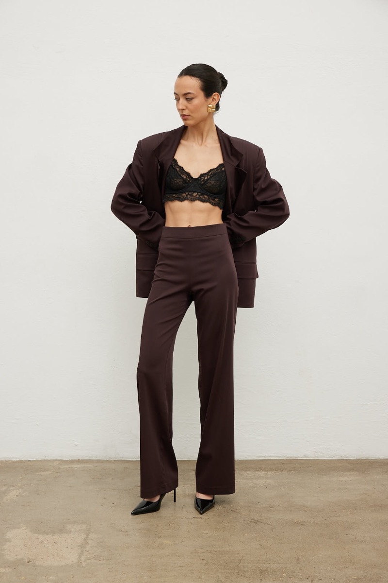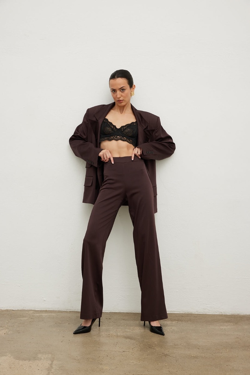 Klasyczne eleganckie spodnie wykonane z gładkiej tkaniny w kolorze brązowym.