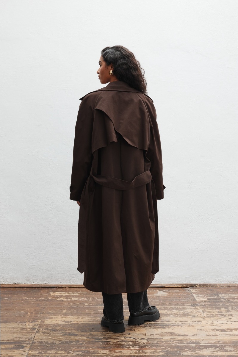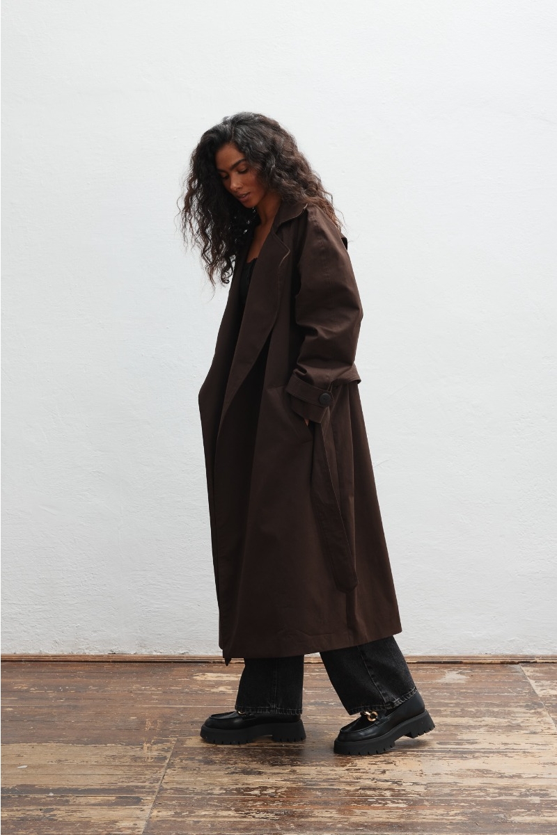 Wykonany z gładkiej bawełny w kolorze brązowym. Trencz jest nie tylko stylowy, ale także komfortowy w noszeniu. Jego obszerny fason i klasyczny kołnierz z klapami nadają mu ponadczasowego charakteru. Możesz go wiązać paskiem, co pozwala na dopasowanie do swojej sylwetki i podkreślenie talii. Ten model posiada długie rękawy wykończone ozdobnym paskiem i guzikiem w kolorze tkaniny.