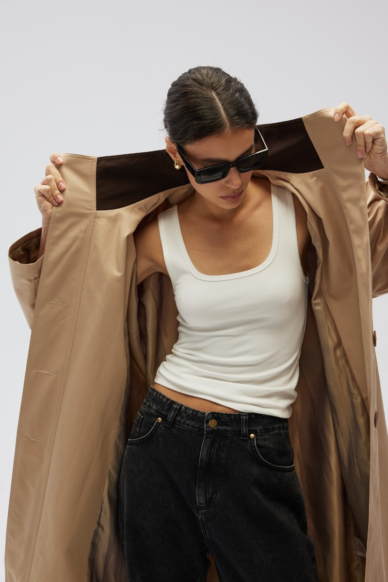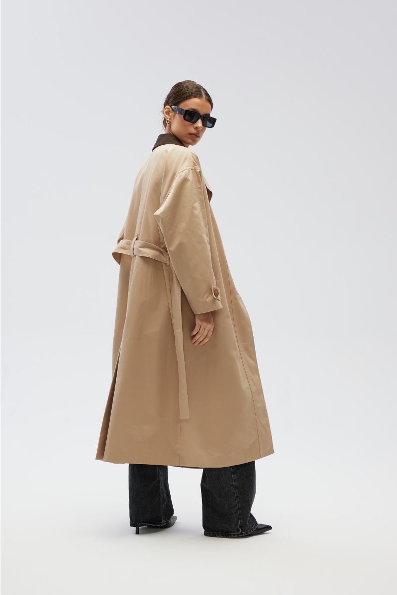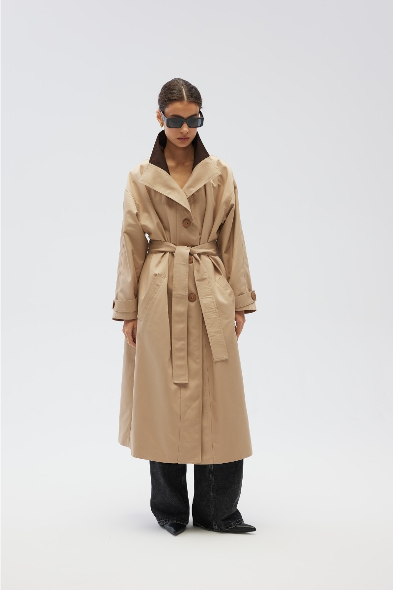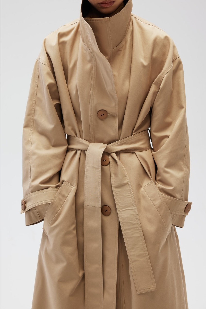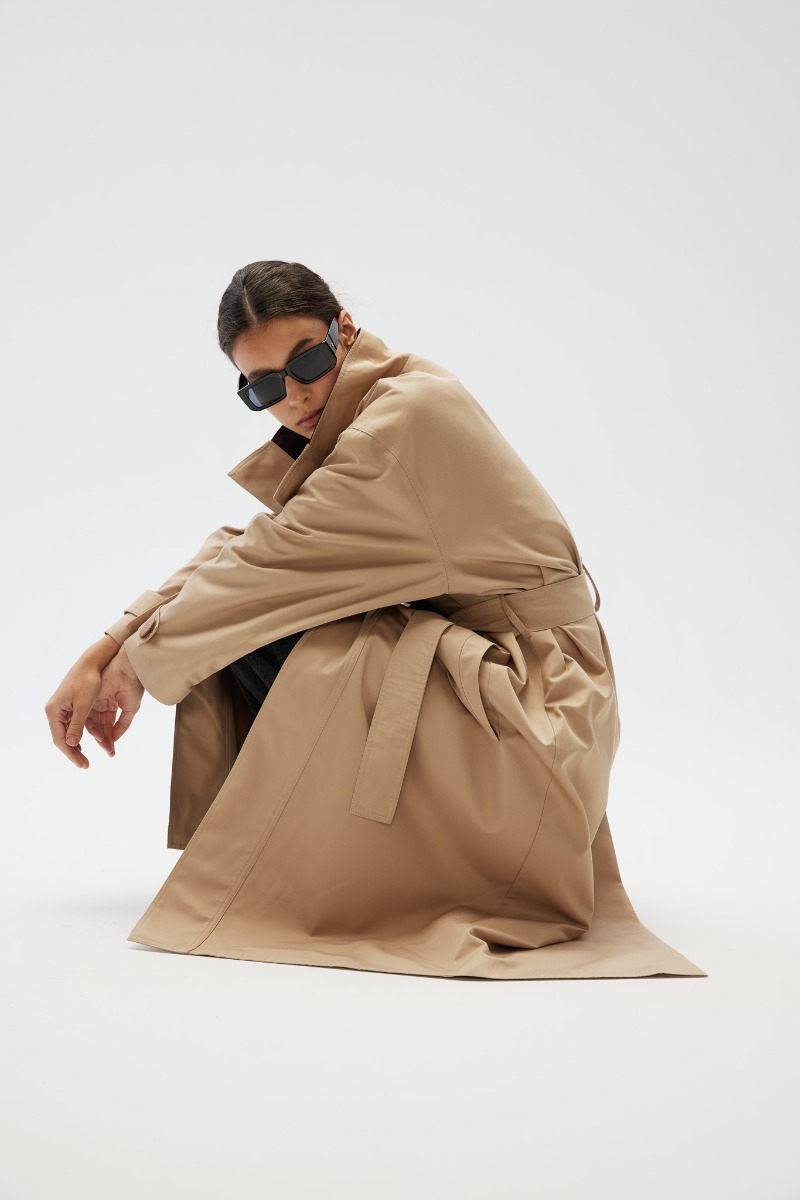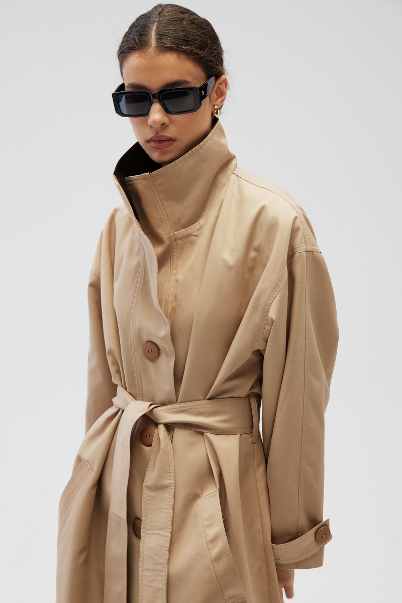 Klasyczny trencz wykonany z tkaniny w kolorze beżowym.