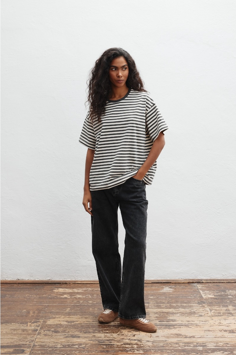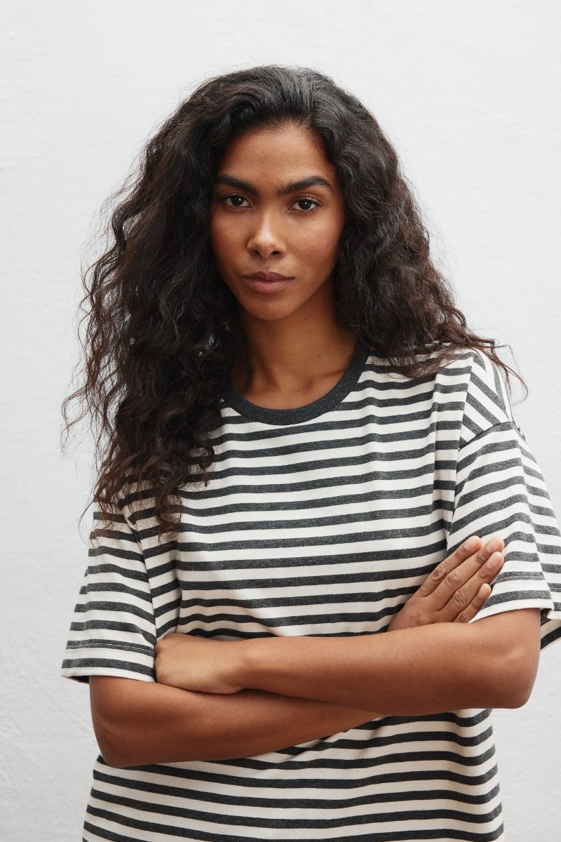 Fason o prostym, pudełkowym kroju z delikatnie obniżoną linią ramion. Rękaw szeroki. Dekolt niewielki, okrągły wykończony ściągaczem. Luźna, inspirowana męską garderobą koszulka, która pasuje niemalże do każdego typu sylwetki - świetnie tuszuje wszelkie niedoskonałości i daje możliwość noszenia zarówno w luźnej formie, jak i delikatnie wpuszczonej do spodni, czy spodenek. Gwarantuje komfort i stylowy wygląd.