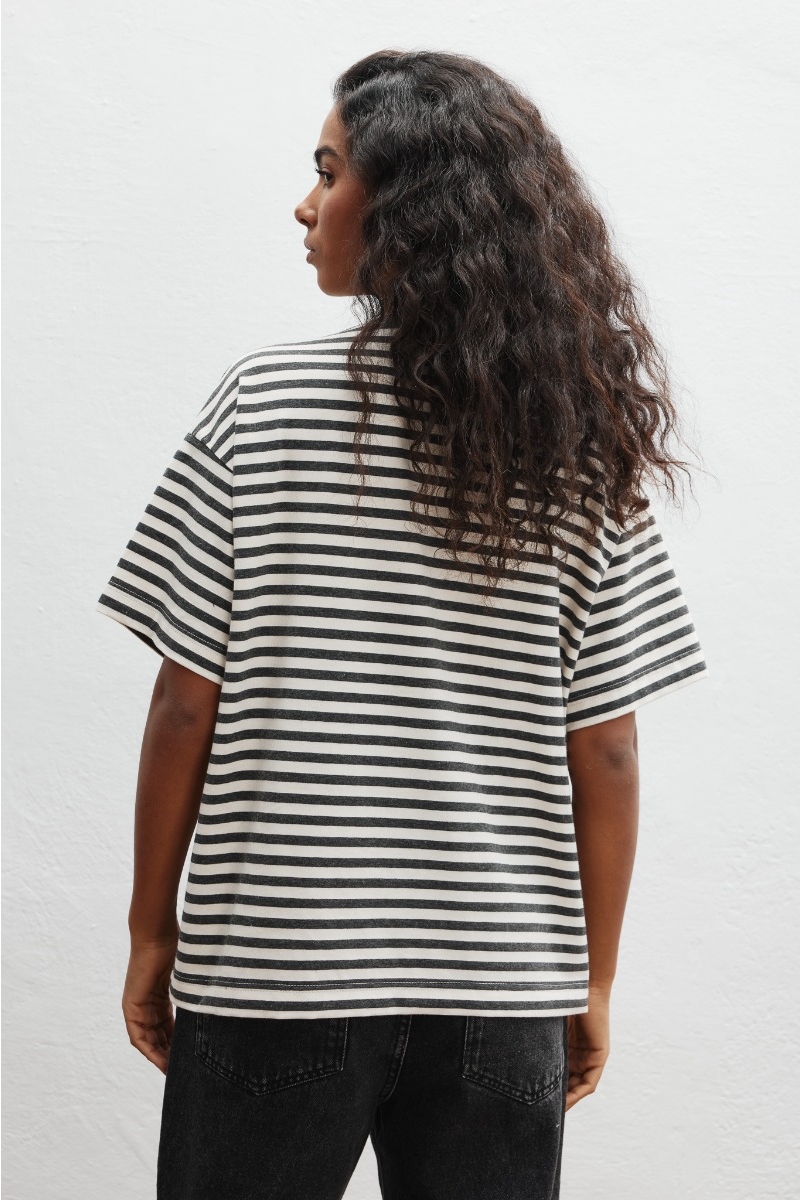 Klasyczny bawełniany t shirt w paski beżowo - grafitowe.