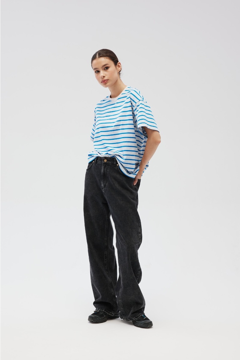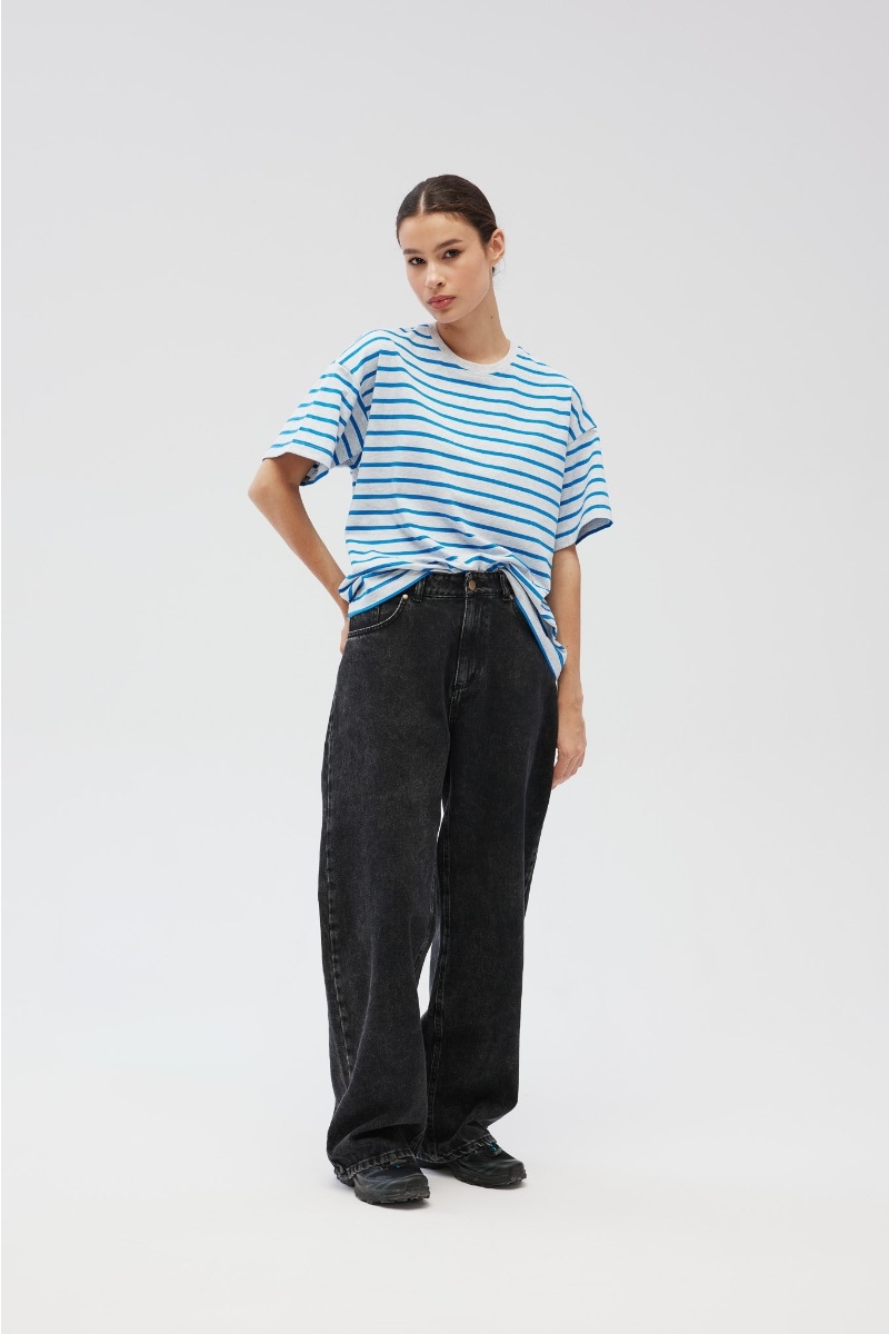 Fason o prostym, pudełkowym kroju z delikatnie obniżoną linią ramion. Rękaw szeroki. Dekolt niewielki, okrągły wykończony ściągaczem. Luźna, inspirowana męską garderobą koszulka, która pasuje niemalże do każdego typu sylwetki - świetnie tuszuje wszelkie niedoskonałości i daje możliwość noszenia zarówno w luźnej formie, jak i delikatnie wpuszczonej do spodni, czy spodenek. Gwarantuje komfort i stylowy wygląd.
