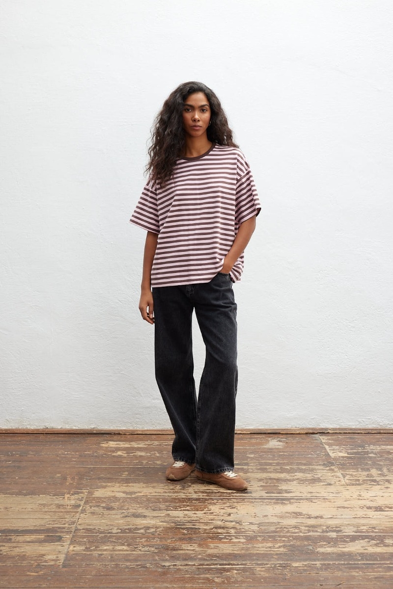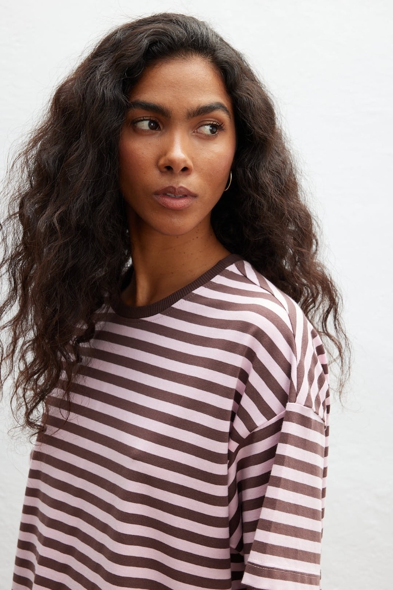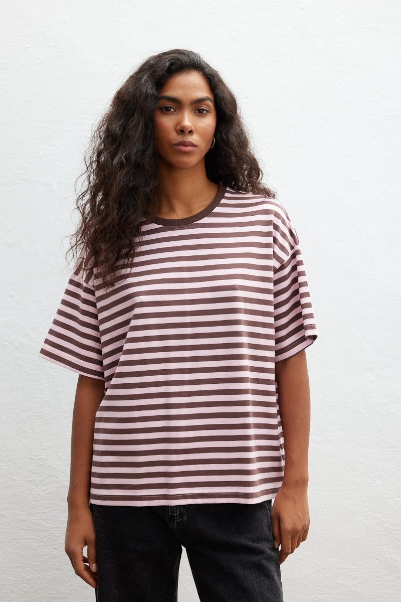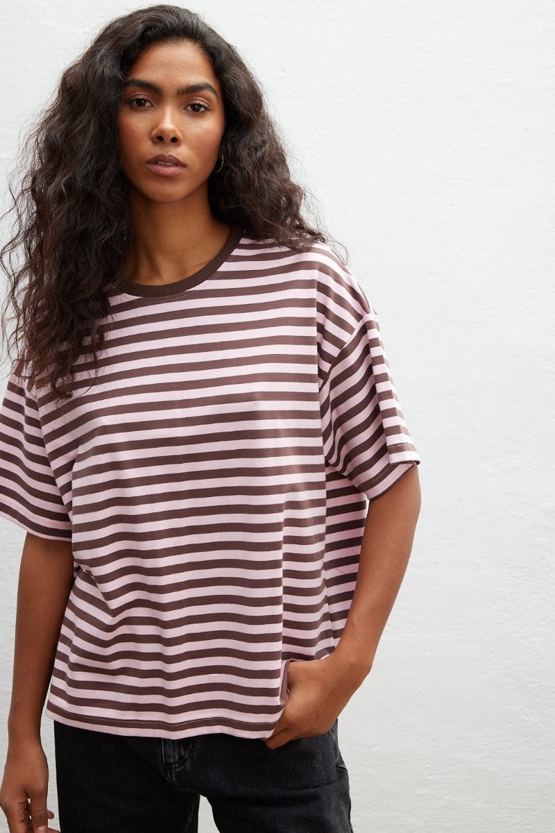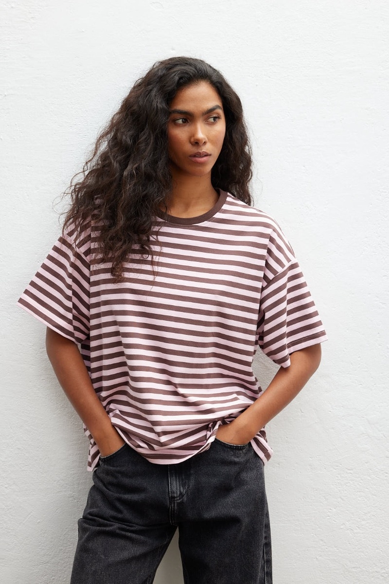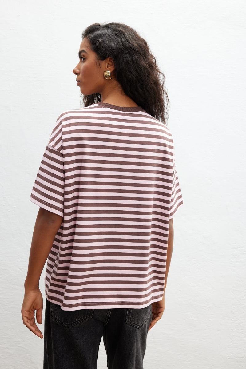 Klasyczny bawełniany t shirt w paski różowo brązowe.