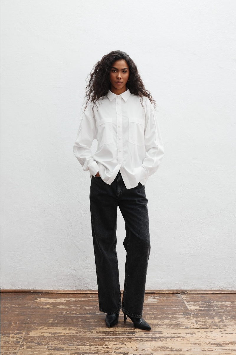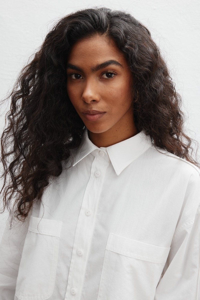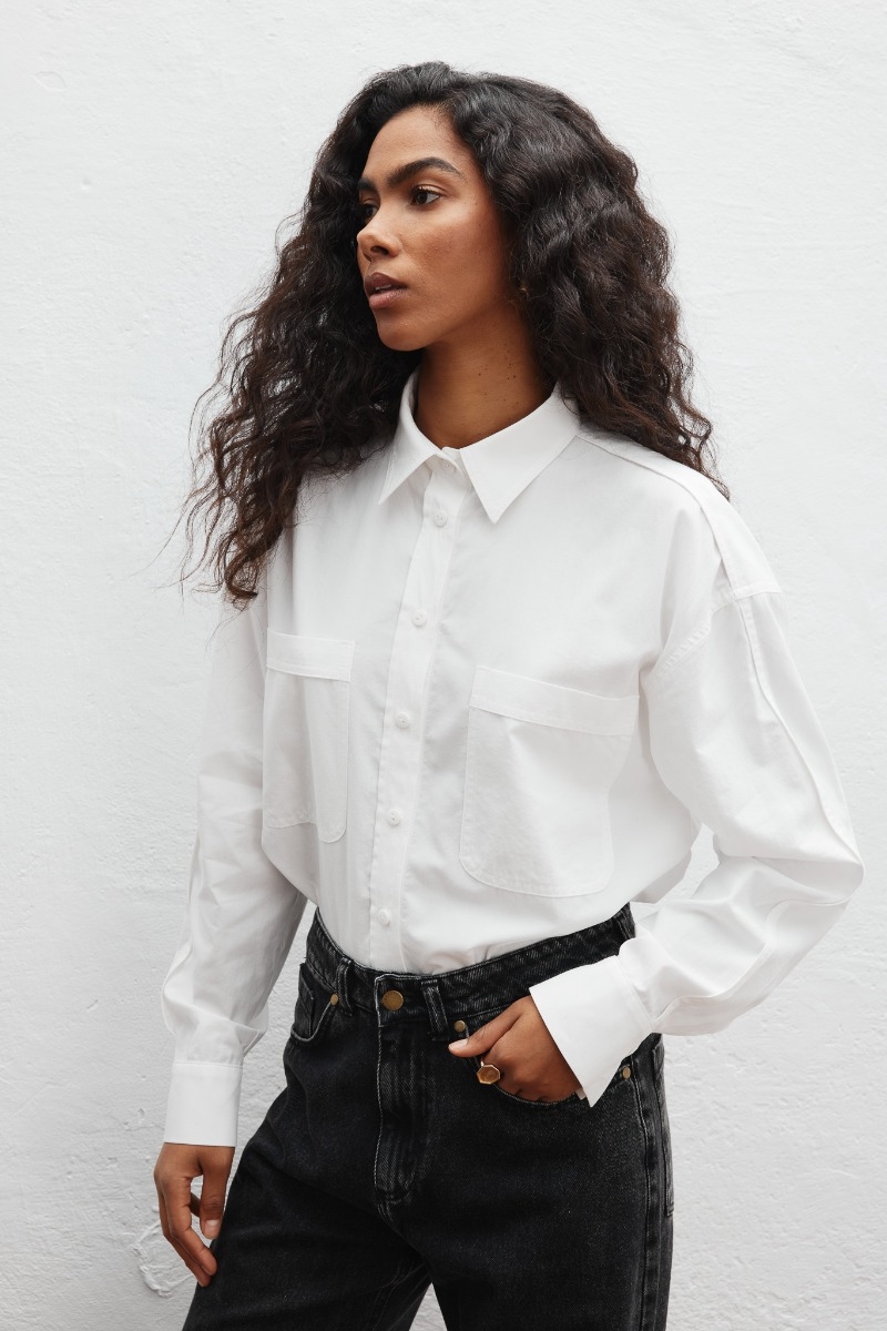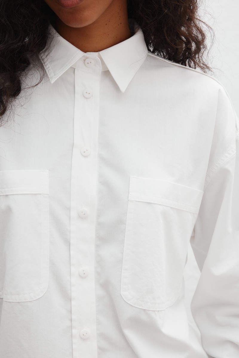 Klasyczna koszula wykonana z tkaniny w kolorze kremowym.