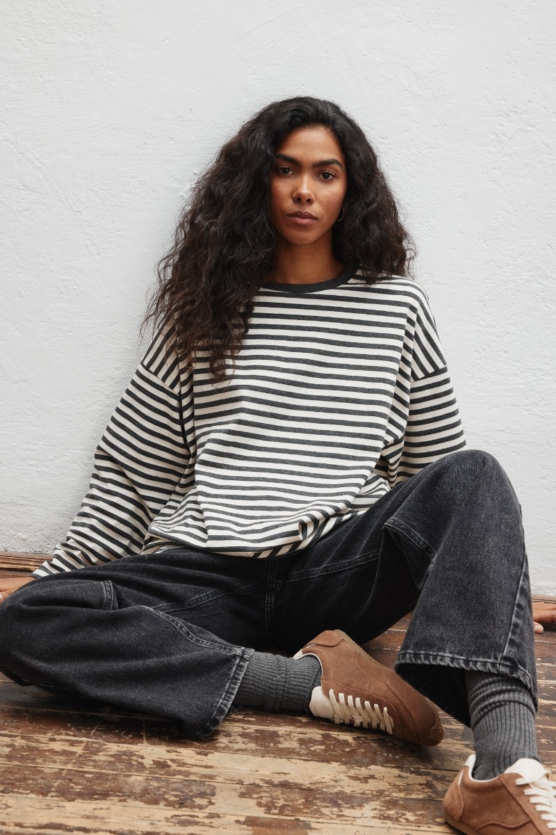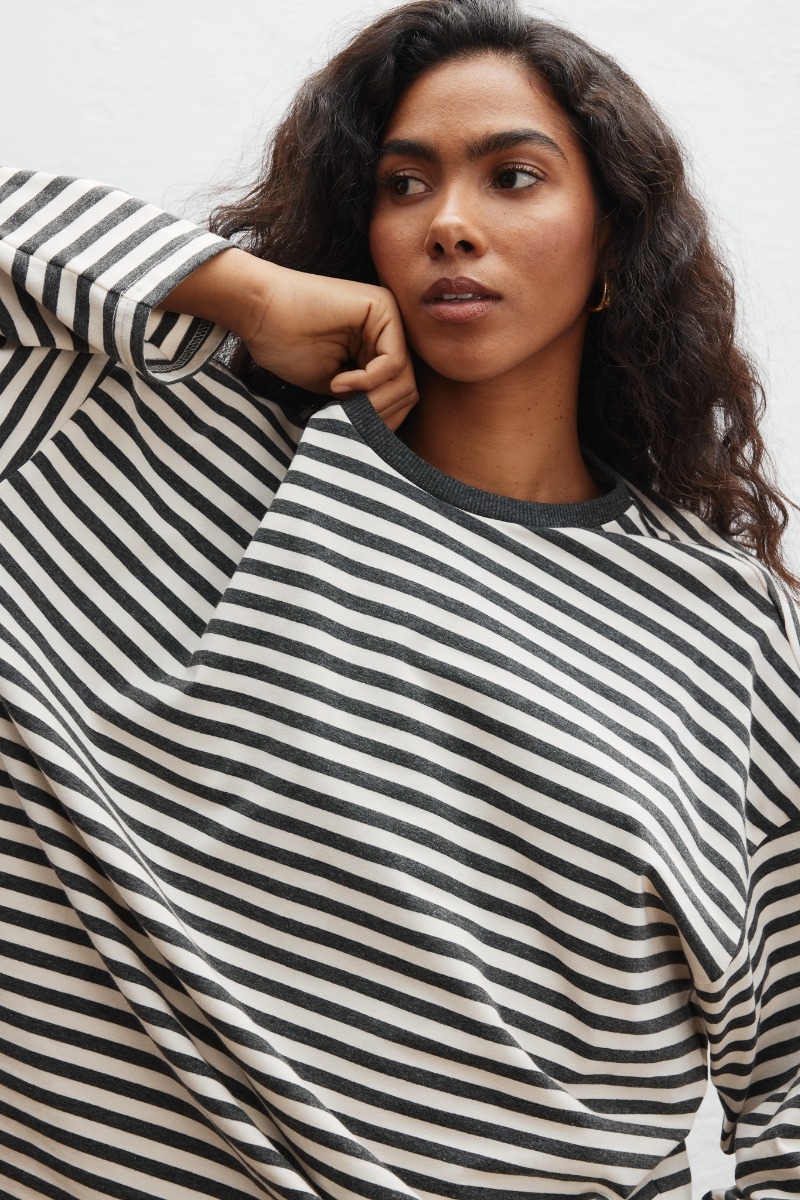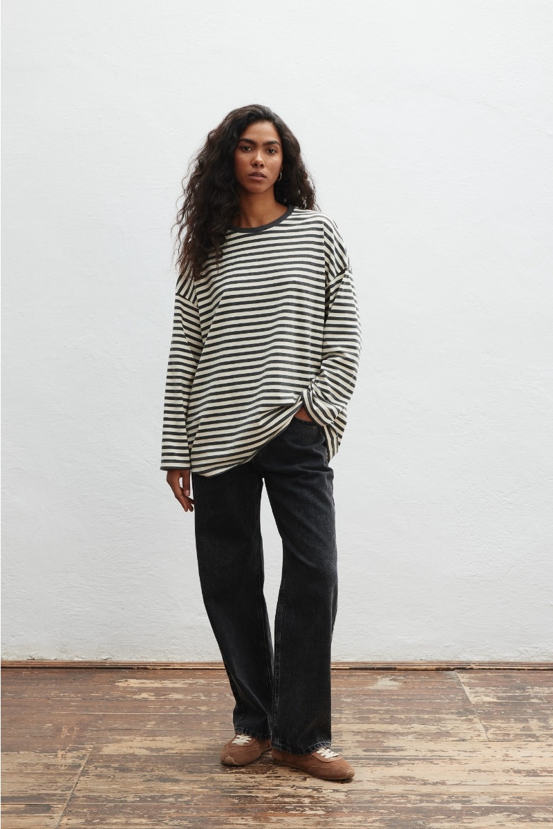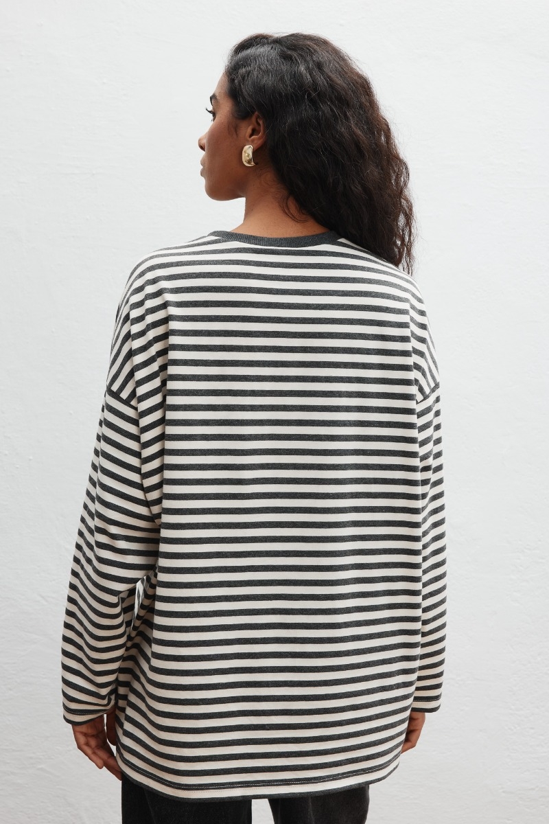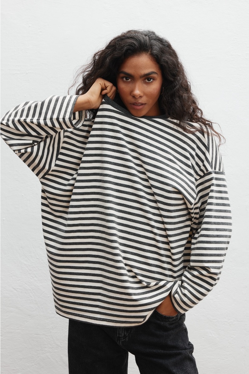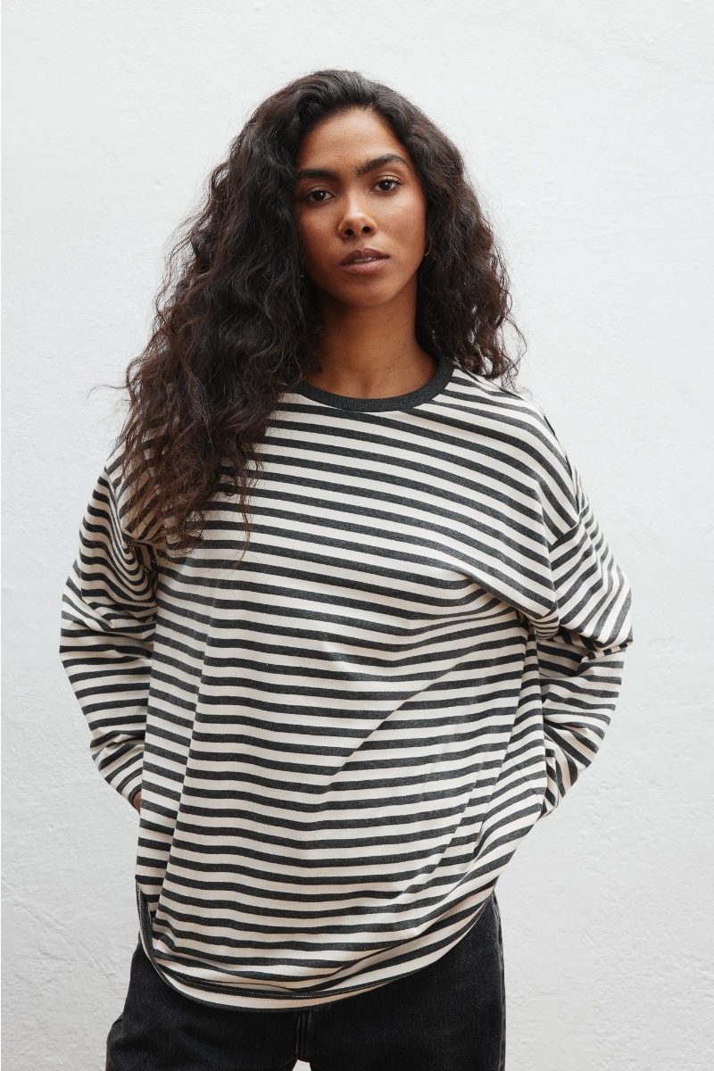 Klasyczny longsleeve wykonany z bawełny w paski, w kolorze beżowo grafitowym.