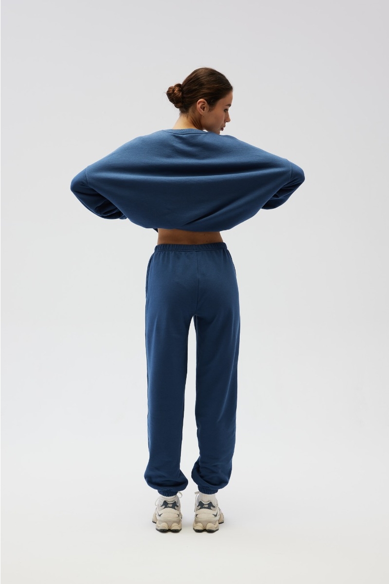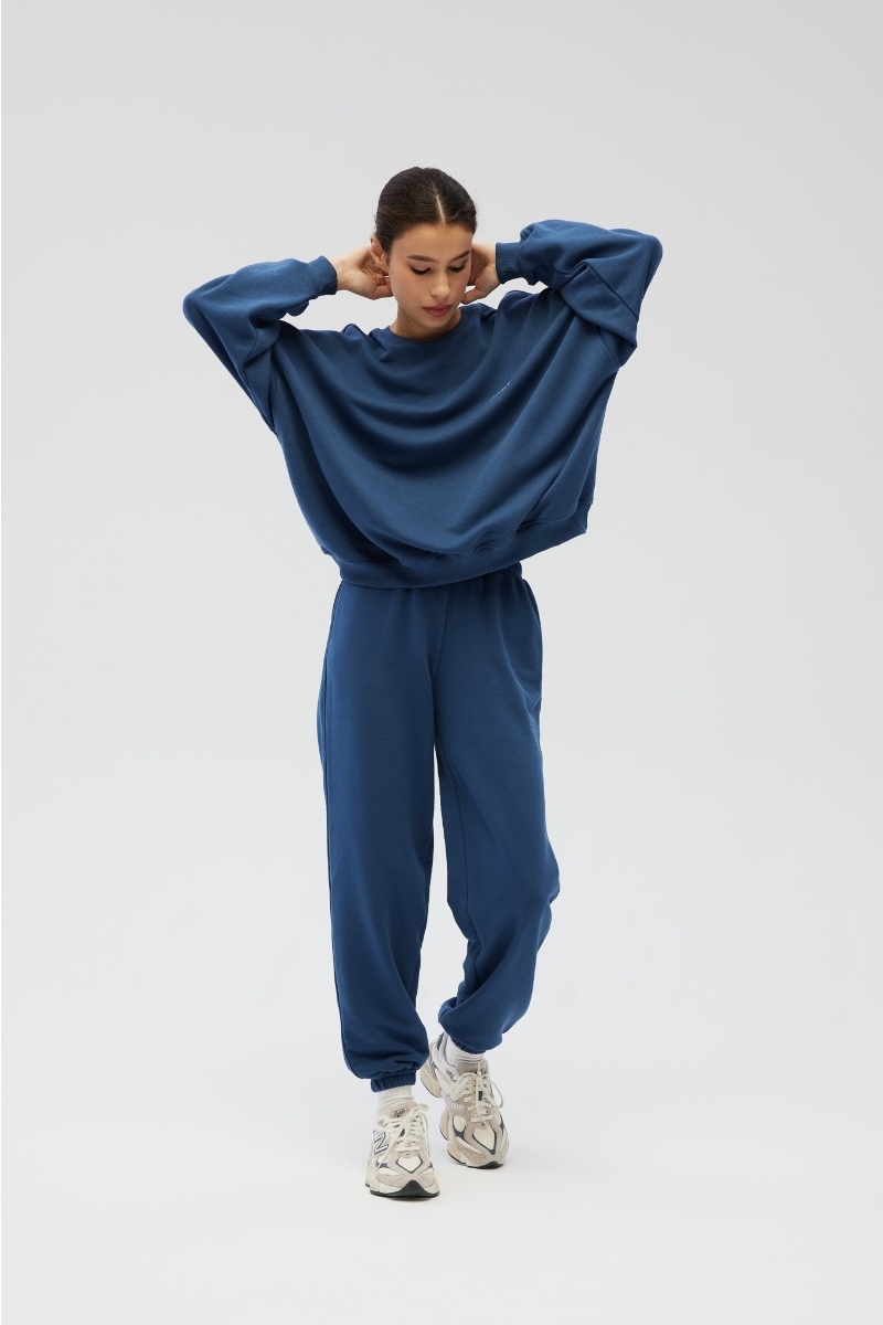 Joggery damskie wykonane z dzianiny w kolorze niebieskim.