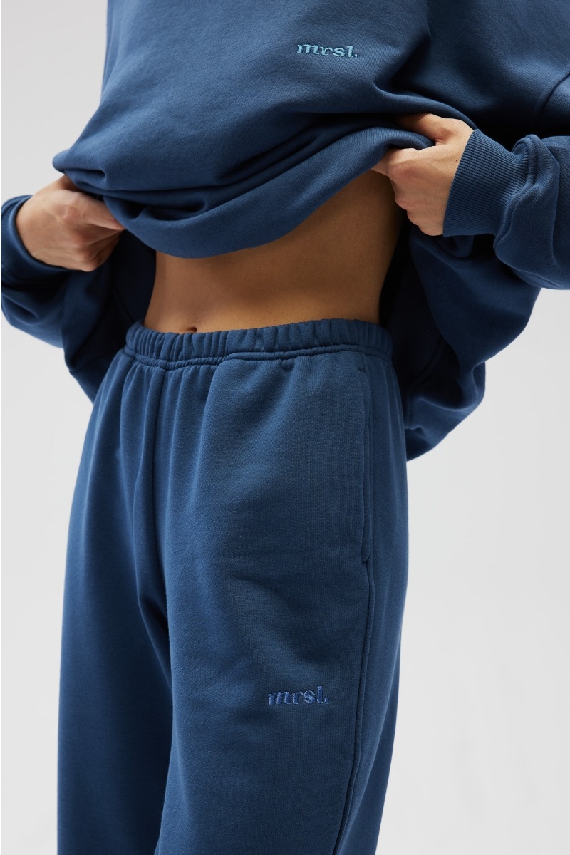 Spodnie o luźnym kroju, oraz szerokimi nogawkami wykończonymi gumą. Na lewej nogawce minimalistyczny haft MRSL w kolorze dzianiny.