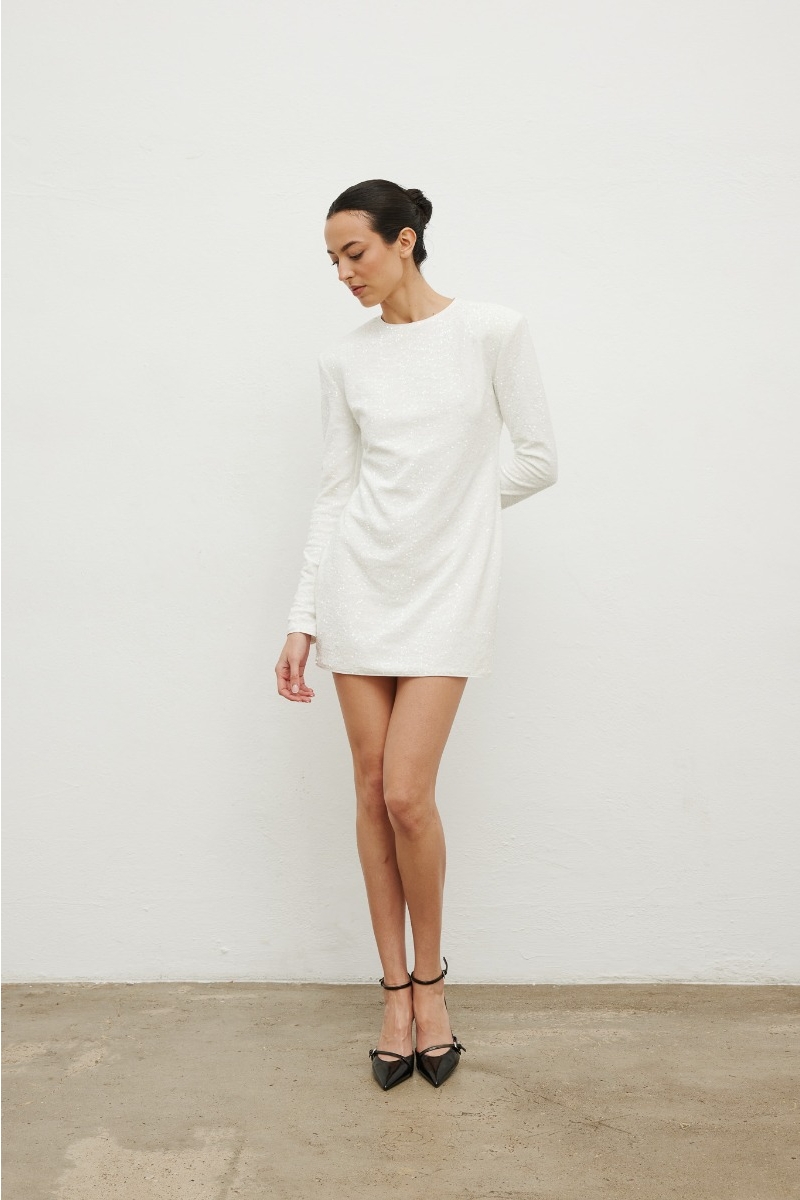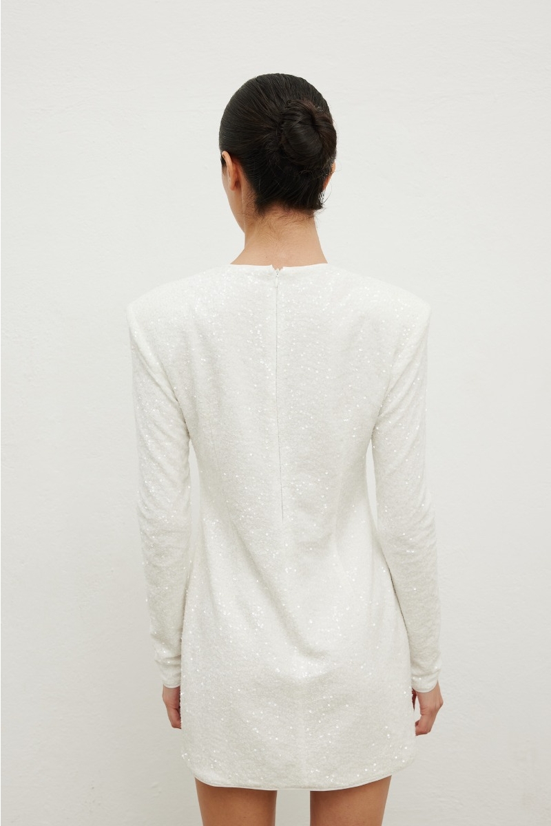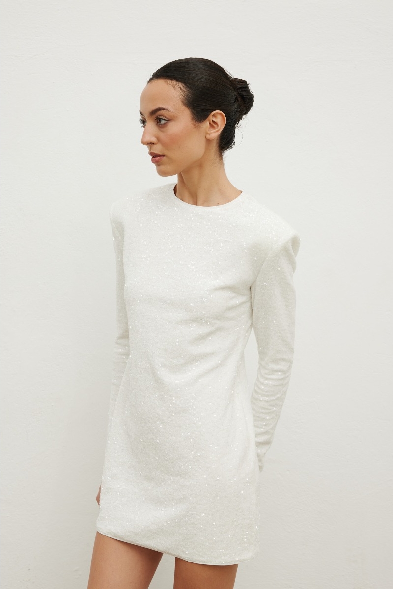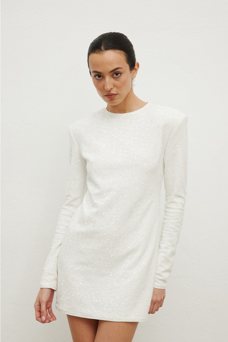 Elegancka, lekko dopasowana sukienka mini, w całości pokryta drobnymi, połyskującymi cekinami, które tworzą subtelny, równomierny błysk. Model posiada długie, smukłe rękawy oraz klasyczny, zaokrąglony dekolt, który dodaje całości delikatności. W ramionach wszyte są poduszki, dzięki czemu sylwetka zyskuje nowoczesną, lekko zarysowaną linię. Z tyłu znajduje się kryty zamek ułatwiający zakładanie, a wnętrze sukienki wykończone jest gładką podszewką zapewniającą komfort noszenia. To idealna propozycja na wieczorne wyjścia, przyjęcia i wyjątkowe okazje, gdy chcesz lśnić w stylowy, ponadczasowy sposób.
