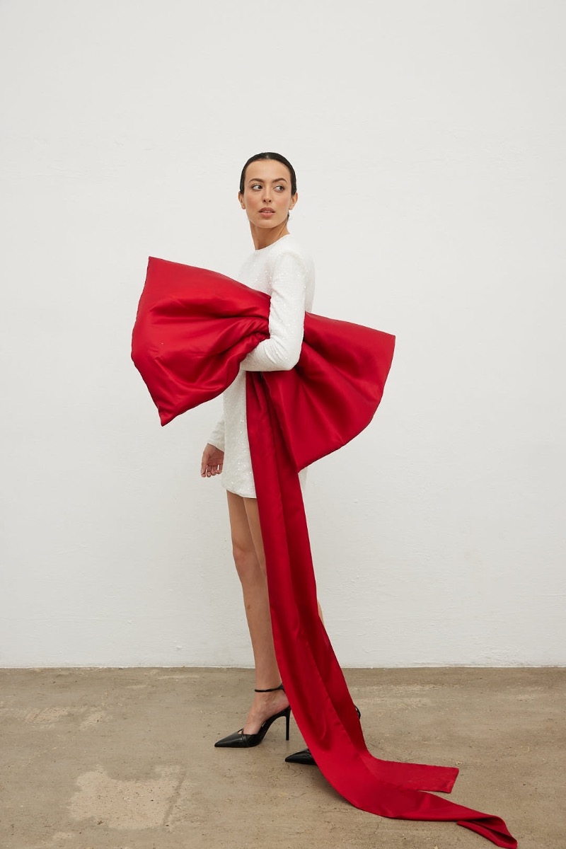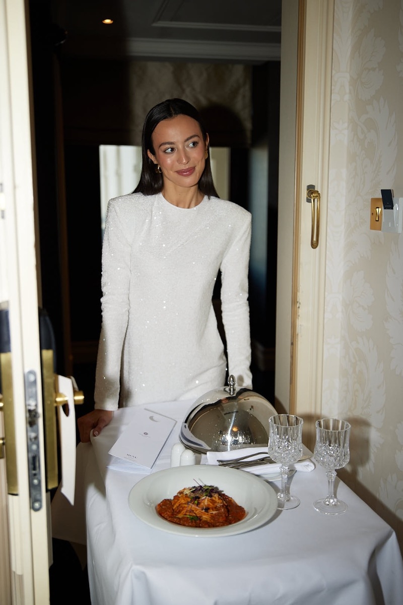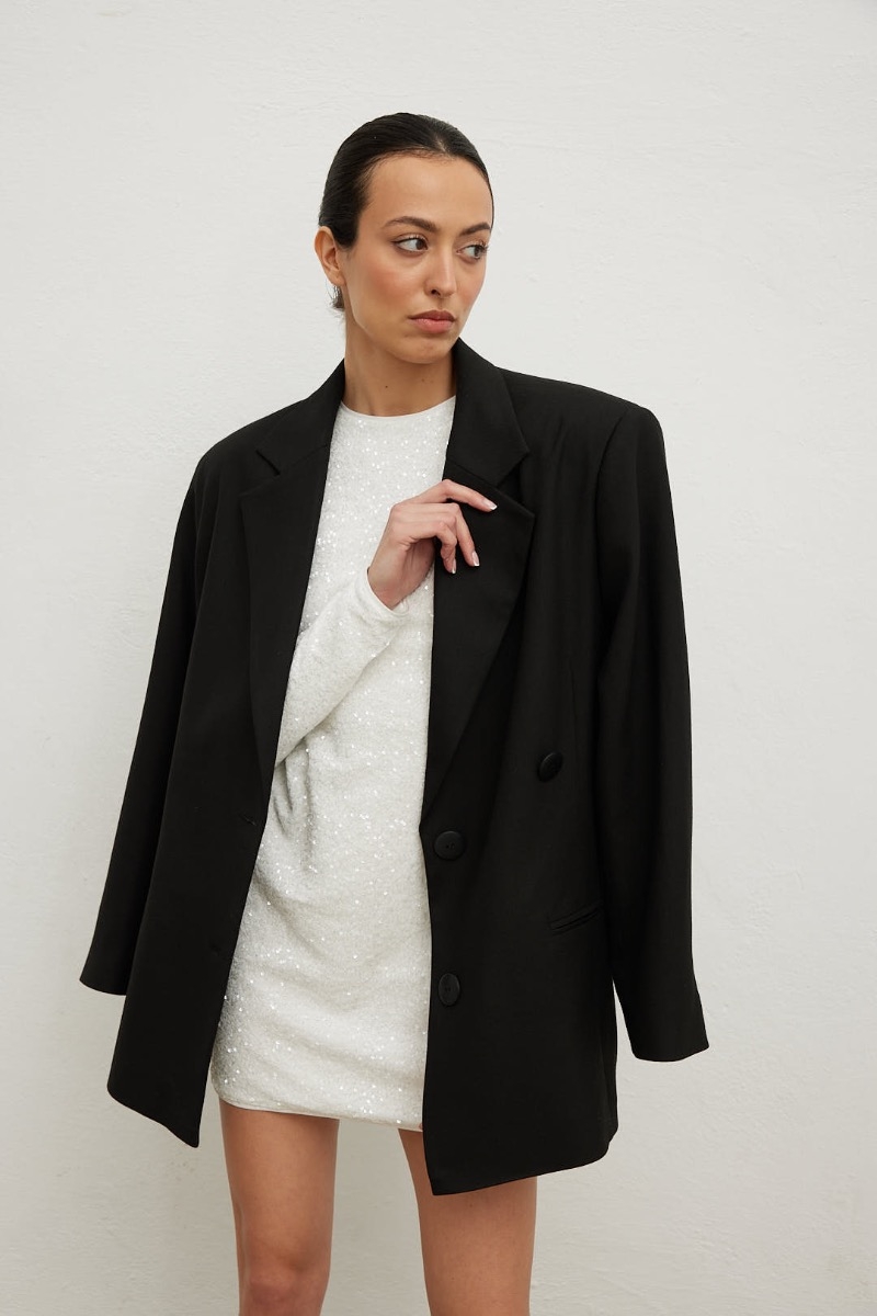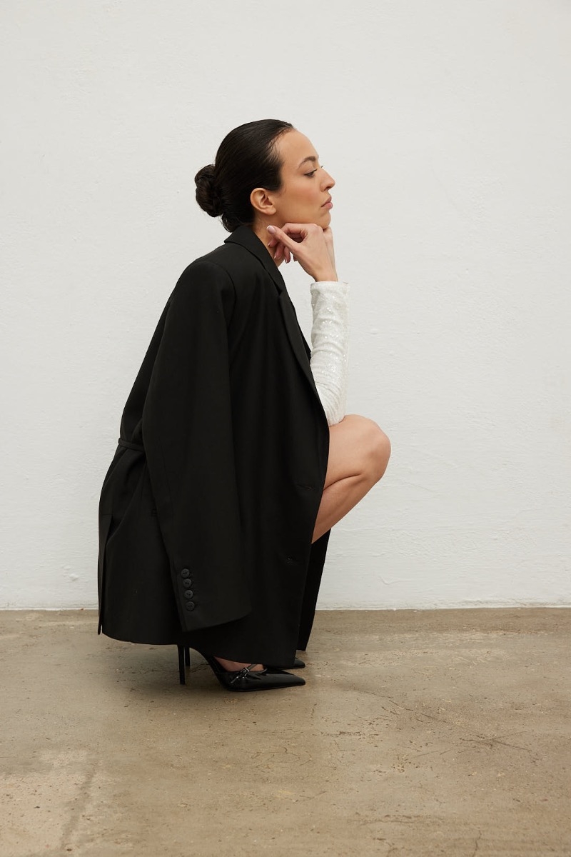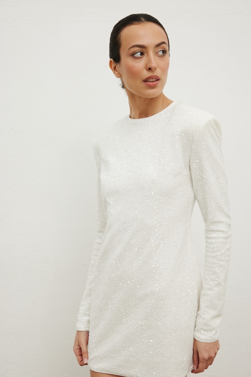 Elegancka, lekko dopasowana sukienka mini, w całości pokryta drobnymi, połyskującymi cekinami, które tworzą subtelny, równomierny błysk. Model posiada długie, smukłe rękawy oraz klasyczny, zaokrąglony dekolt, który dodaje całości delikatności. W ramionach wszyte są poduszki, dzięki czemu sylwetka zyskuje nowoczesną, lekko zarysowaną linię. Z tyłu znajduje się kryty zamek ułatwiający zakładanie, a wnętrze sukienki wykończone jest gładką podszewką zapewniającą komfort noszenia. To idealna propozycja na wieczorne wyjścia, przyjęcia i wyjątkowe okazje, gdy chcesz lśnić w stylowy, ponadczasowy sposób.