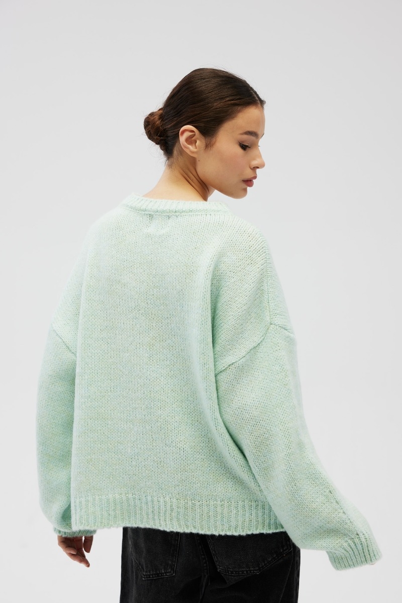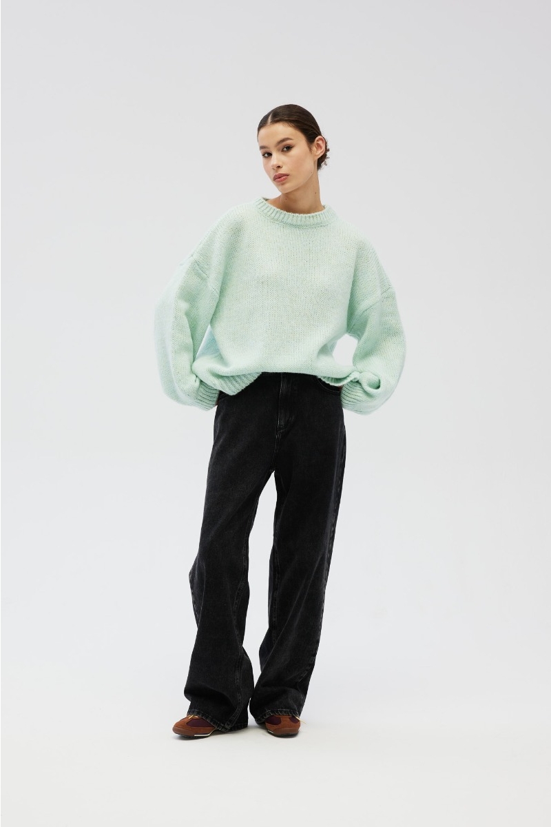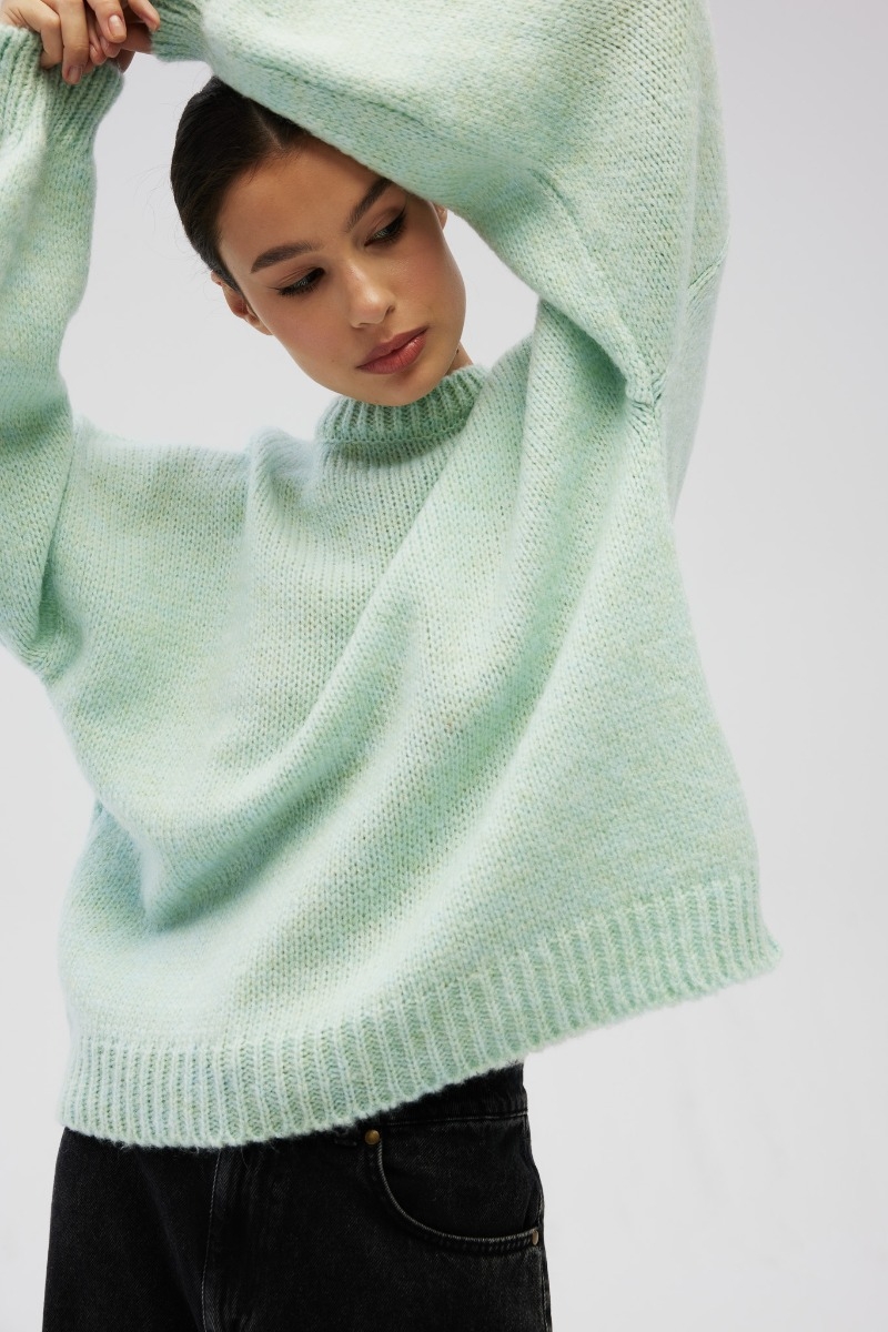 Sweter damski o luźnym kroju z bufiastym rękawem zakończonym mankietem w kolorze jasno zielonym.