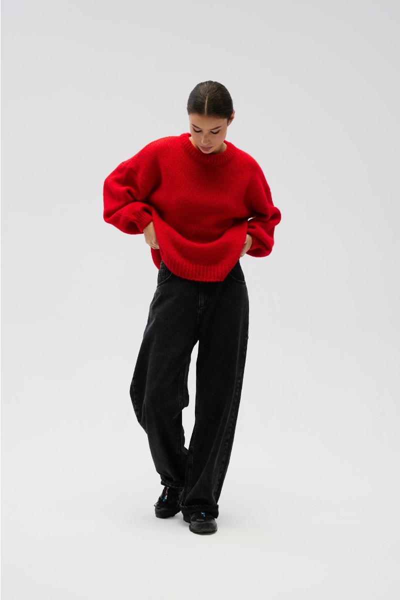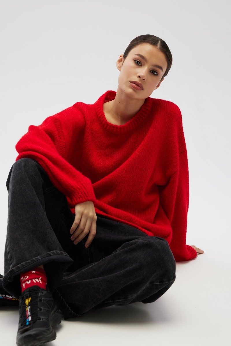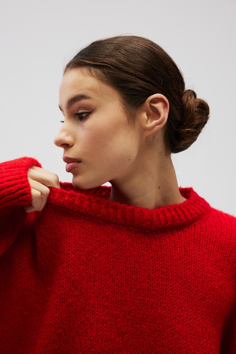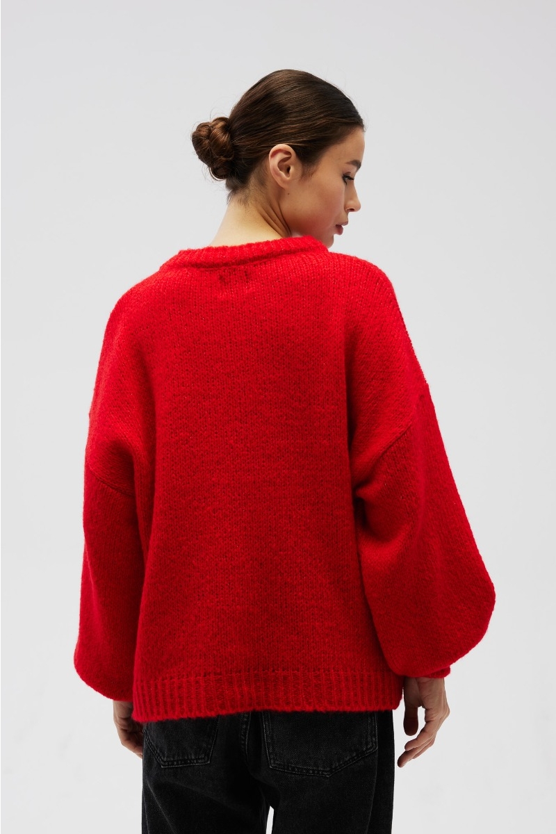 Sweter damski o luźnym kroju z bufiastym rękawem zakończonym mankietem w kolorze czerwonym.