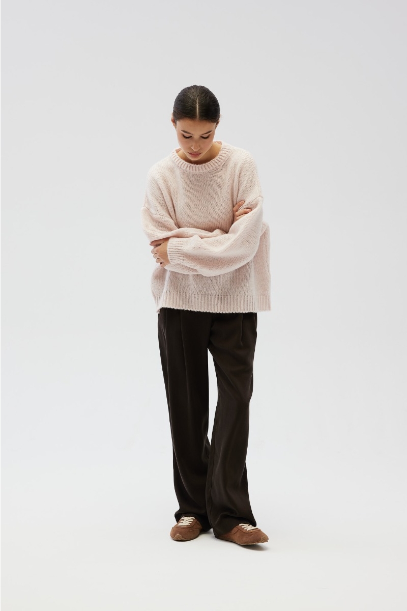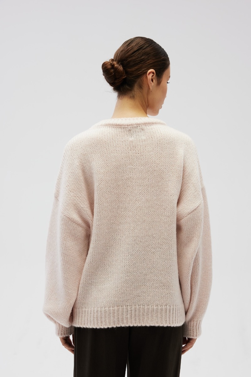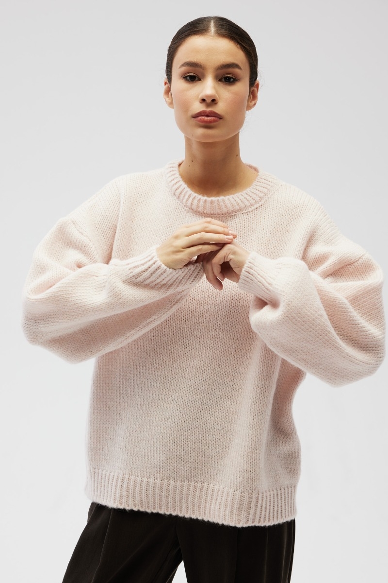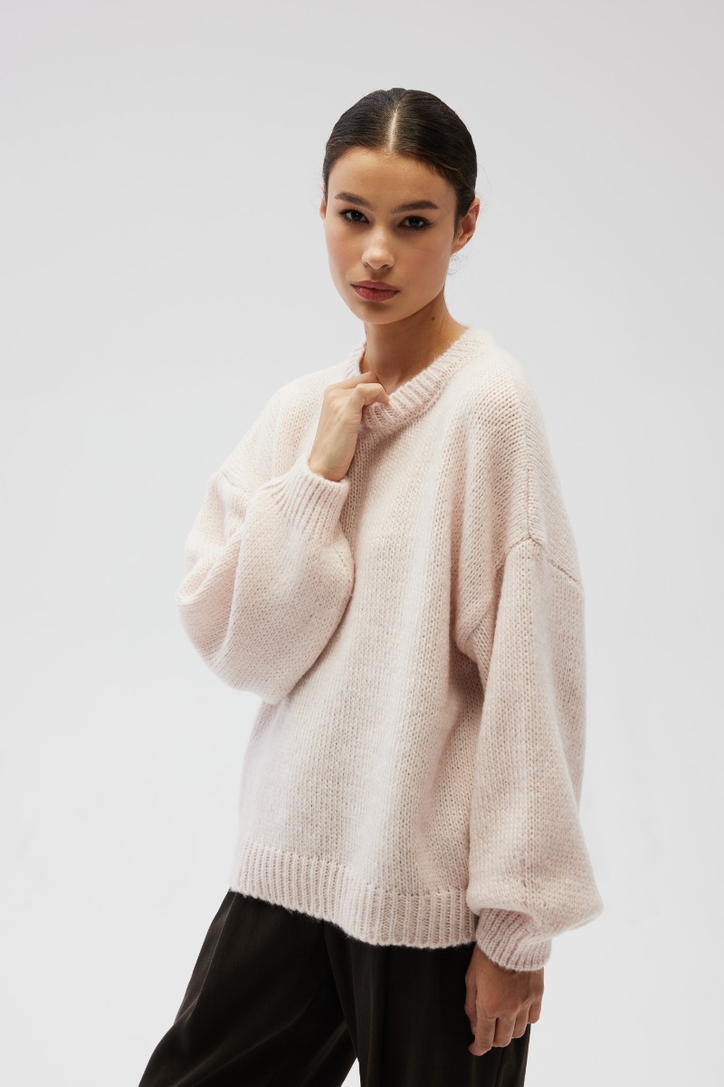 Sweter damski o luźnym kroju z bufiastym rękawem zakończonym mankietem w kolorze różowym.