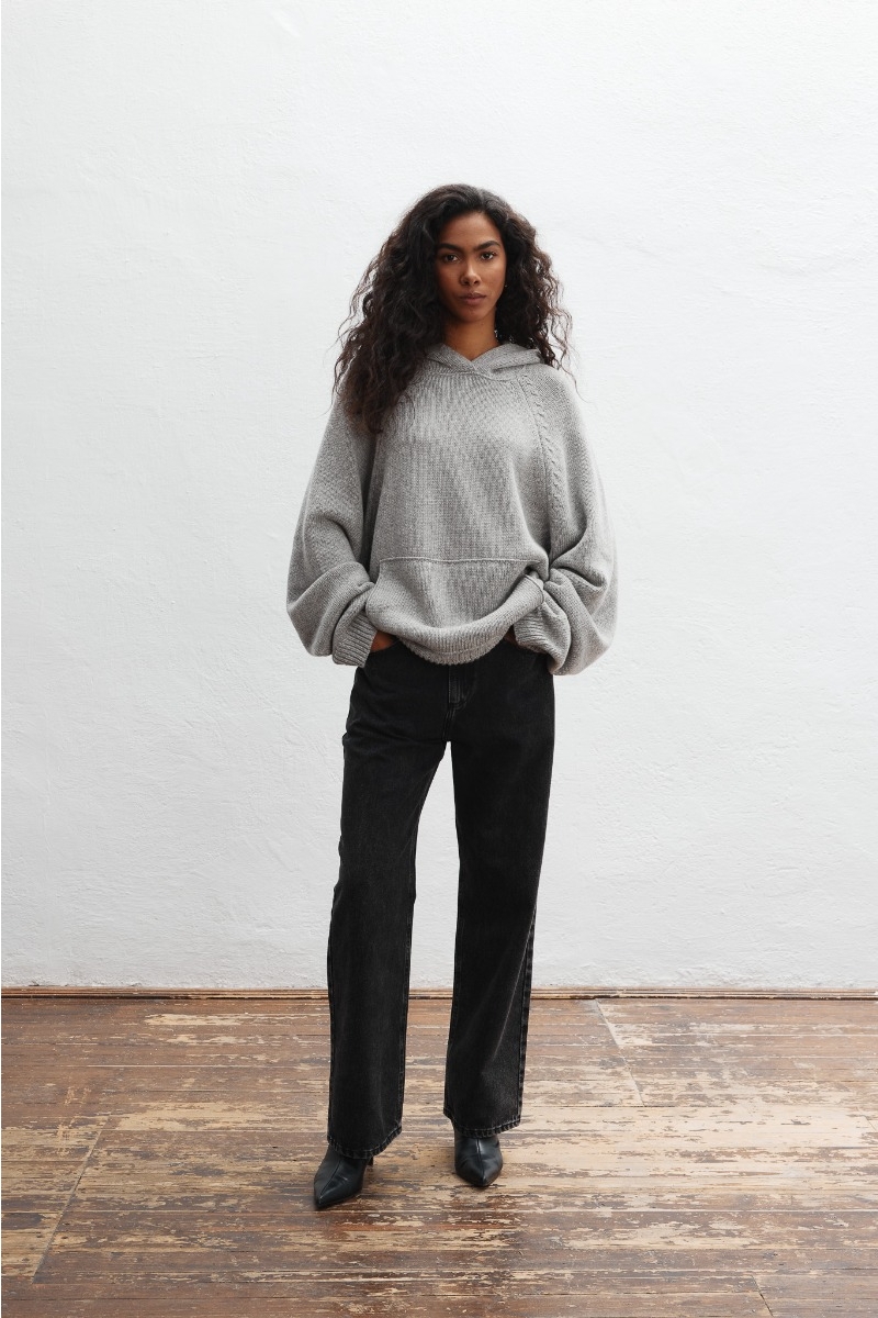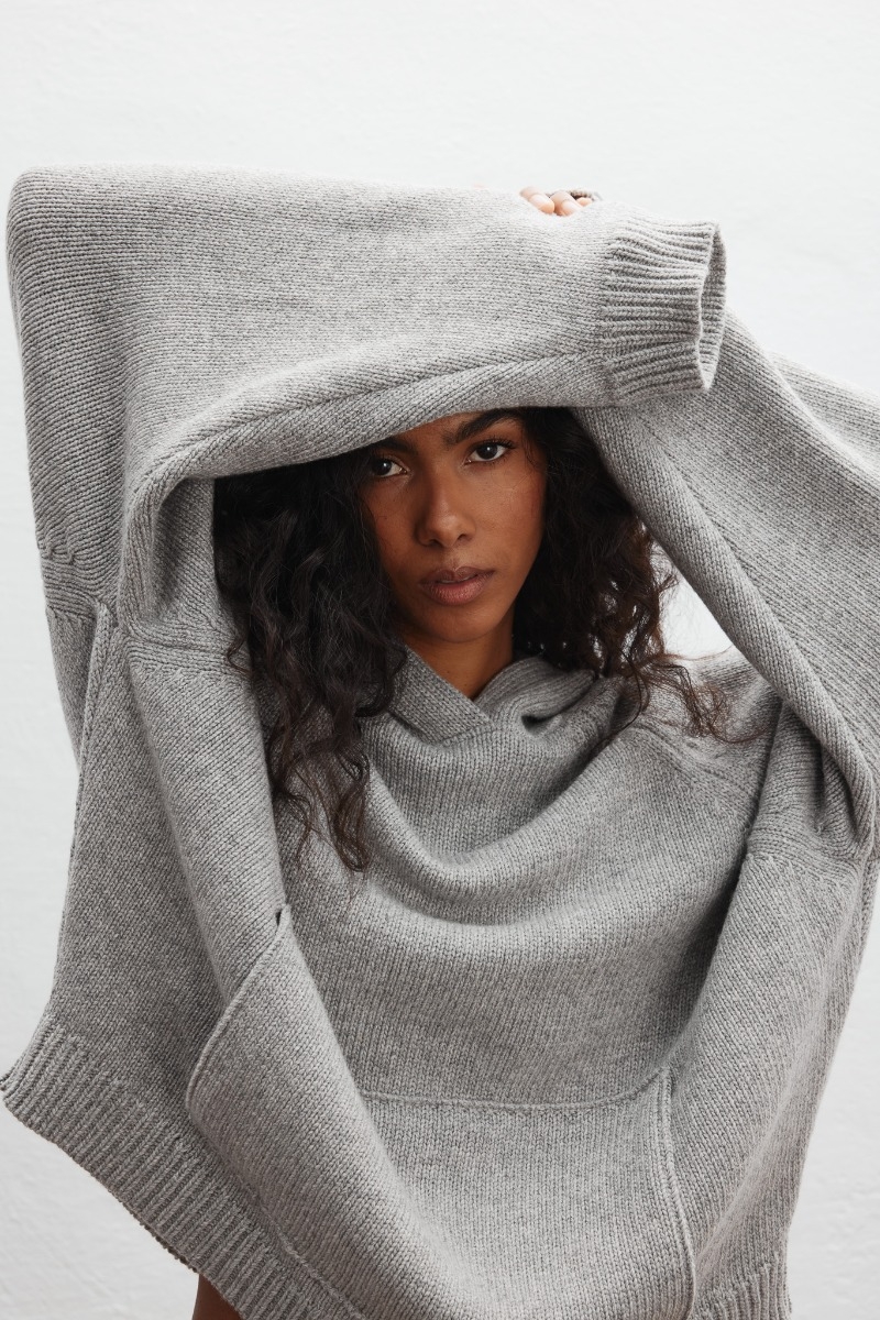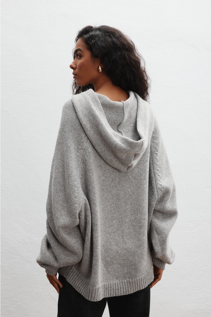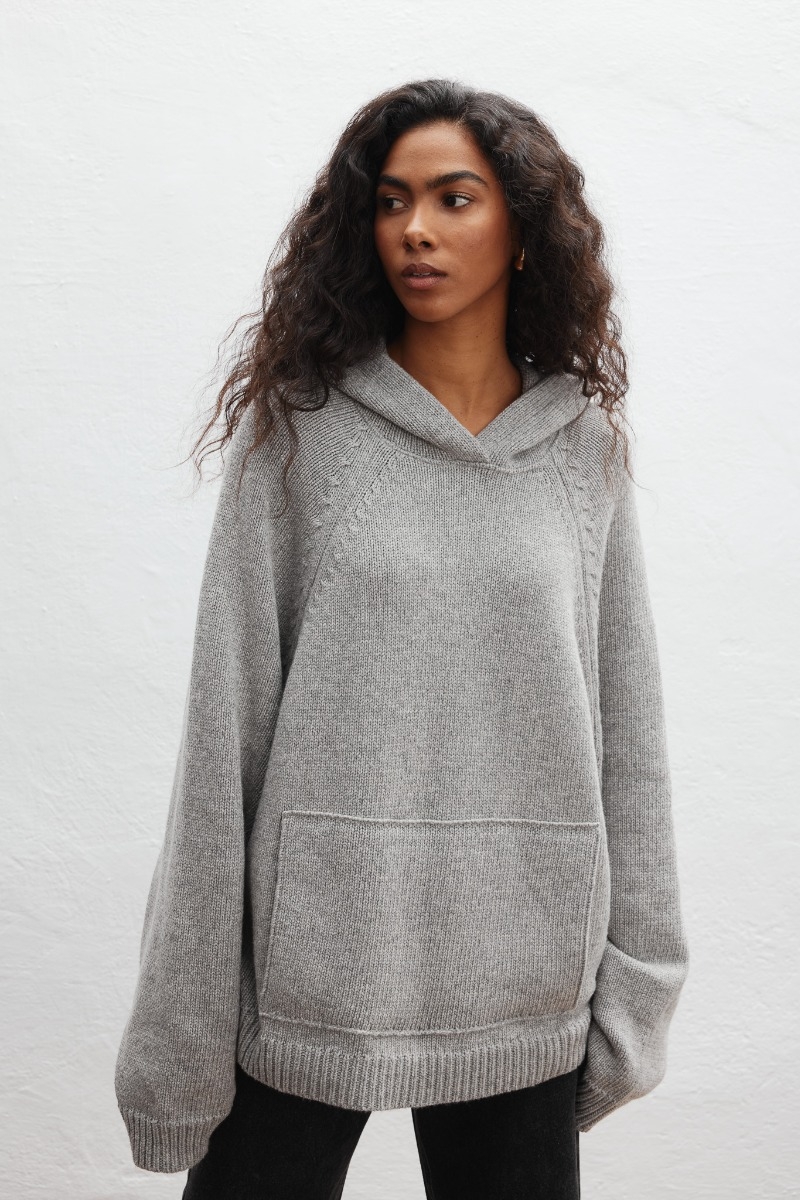 Model o dość luźnym i obszernym kroju, który otula sylwetkę i zapewnia swobodę ruchów. Rękawy oraz dolna część swetra wykończona innym splotem, dając efekt " ściagacza ". Z przodu dwa ozdobne ściegi oraz obszerna kieszeń kangurka. Kaptur dodaje mu swobodnego, miejskiego charakteru, a jego uniwersalna forma pozwala na wiele możliwości stylizacji.