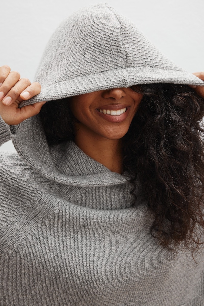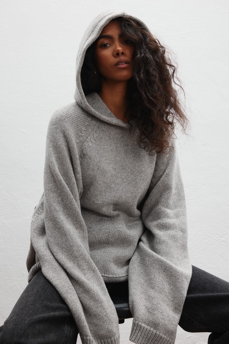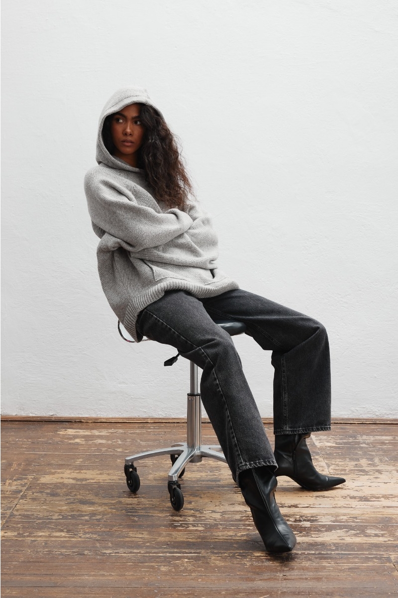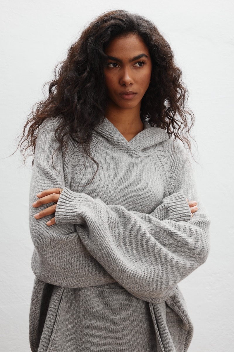 Model o dość luźnym i obszernym kroju, który otula sylwetkę i zapewnia swobodę ruchów. Rękawy oraz dolna część swetra wykończona innym splotem, dając efekt " ściagacza ". Z przodu dwa ozdobne ściegi oraz obszerna kieszeń kangurka. Kaptur dodaje mu swobodnego, miejskiego charakteru, a jego uniwersalna forma pozwala na wiele możliwości stylizacji.