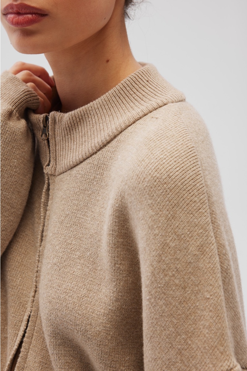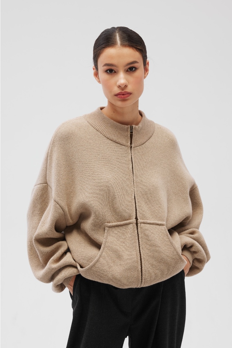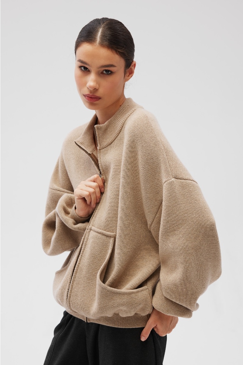 Oversize’owy sweter w odcieniu ciepłego beżu to połączenie komfortu i nowoczesnej elegancji. Wykonany z miękkiej, przyjemnej w dotyku przędzy, zapewnia wygodę noszenia przez cały dzień. Posiada szerokie rękawy zakończone delikatnym ściągaczem oraz praktyczne kieszenie z przodu, które dodają mu codziennego charakteru. Zamek na całej długości umożliwia regulację dekoltu i sprawia, że sweter łatwo dopasować do różnych stylizacji. Świetnie sprawdzi się zarówno w luźnych, casualowych zestawach, jak i jako element minimalistycznego, miejskiego looku.