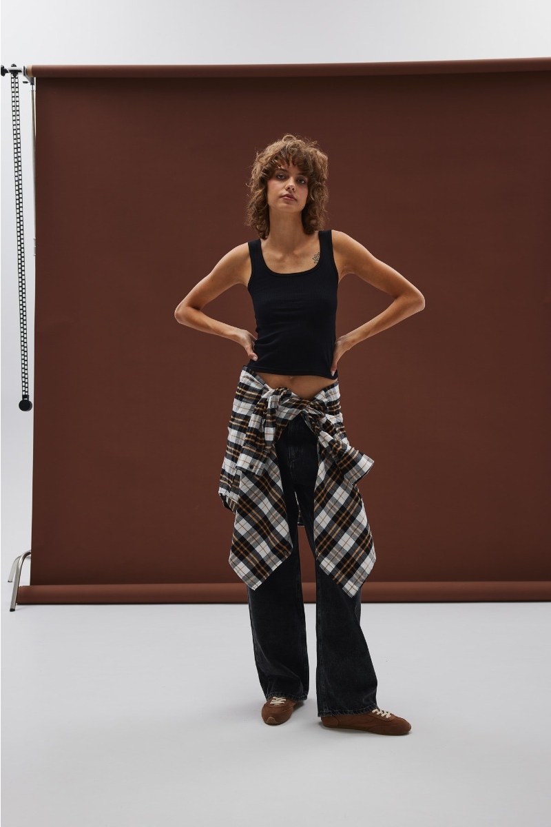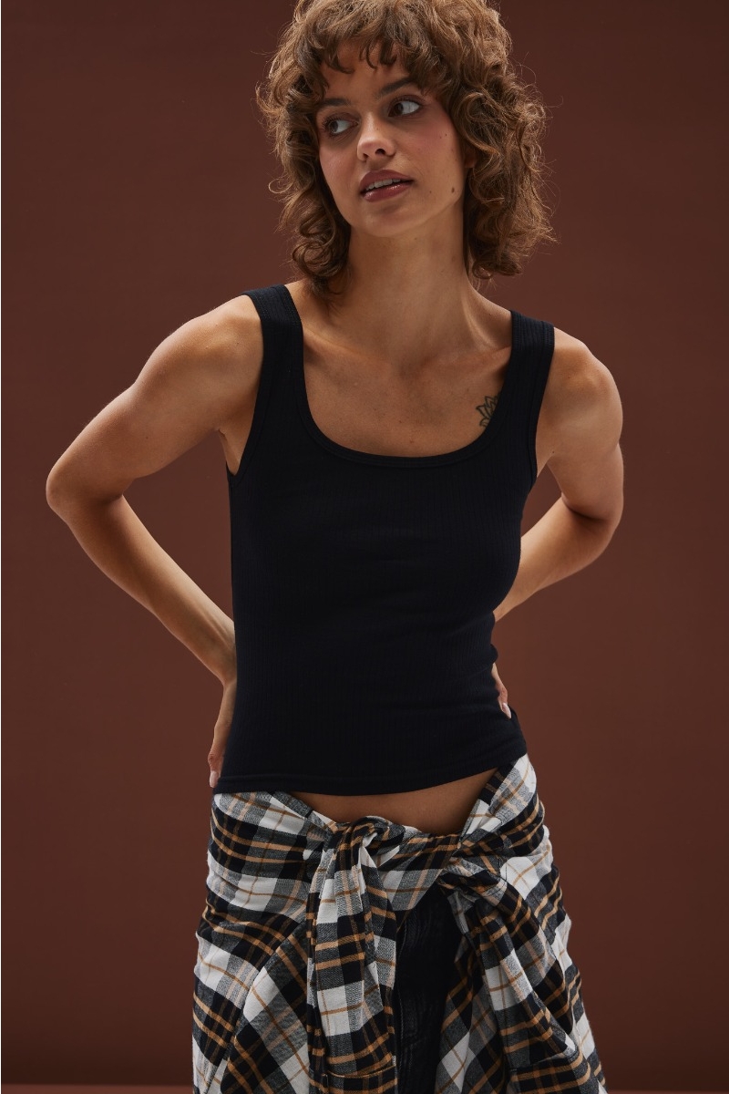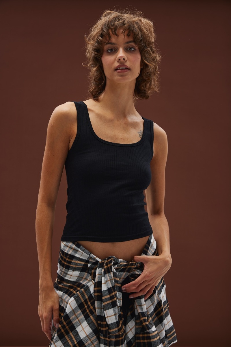 Klasyczny top na ramiączkach wykonany z prążkowanej bawełny, w czarnym kolorze.