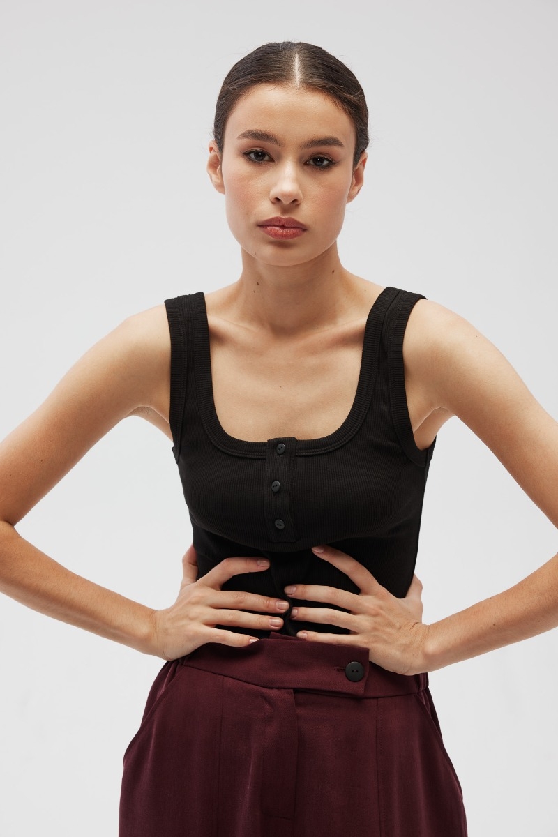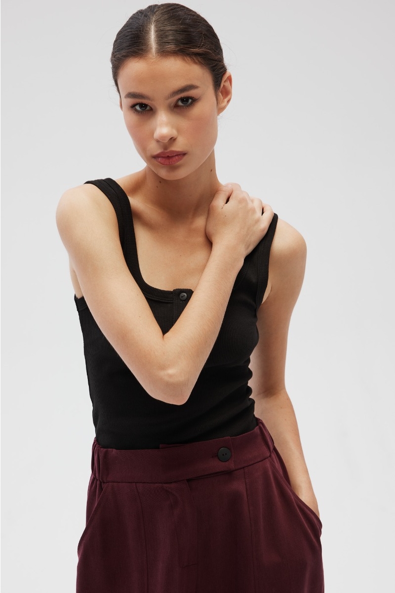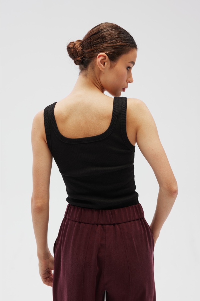 Klasyczny top na ramiaczkach wykonany z prążkowanej bawełny w kolorze czarnym.