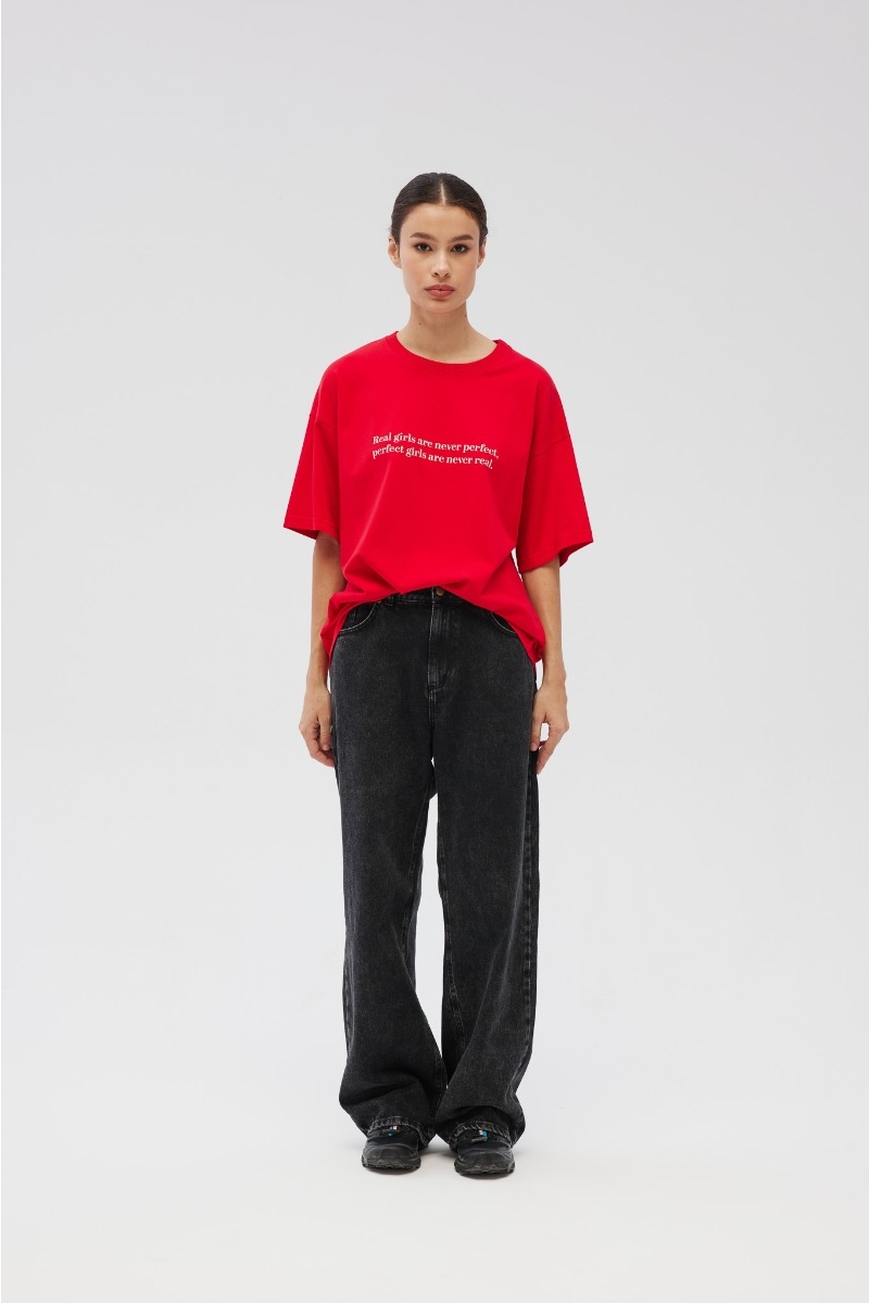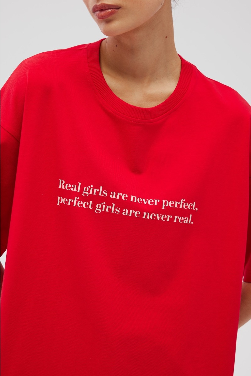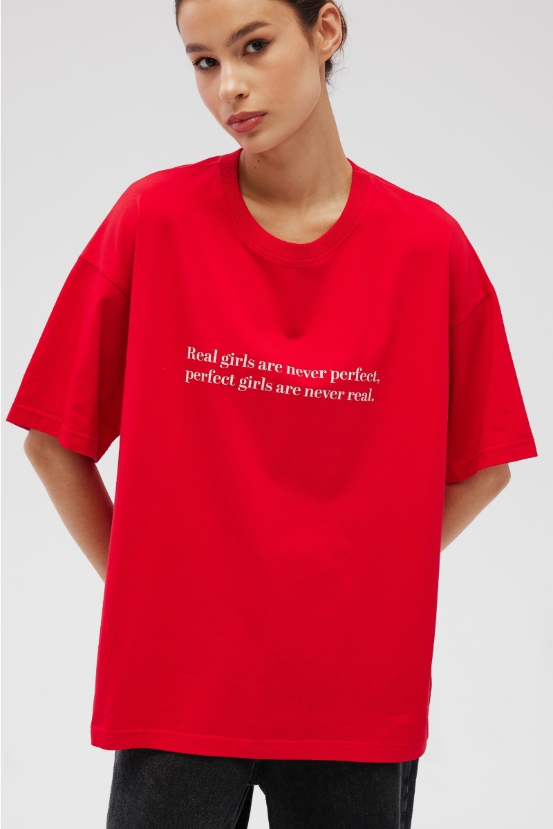 Klasyczny t shirt w kolorze czerwonym z nadrukiem REAL GIRLS ARE NEVER PERFECT, PERFECT GIRLS ARE NEVER REAL.