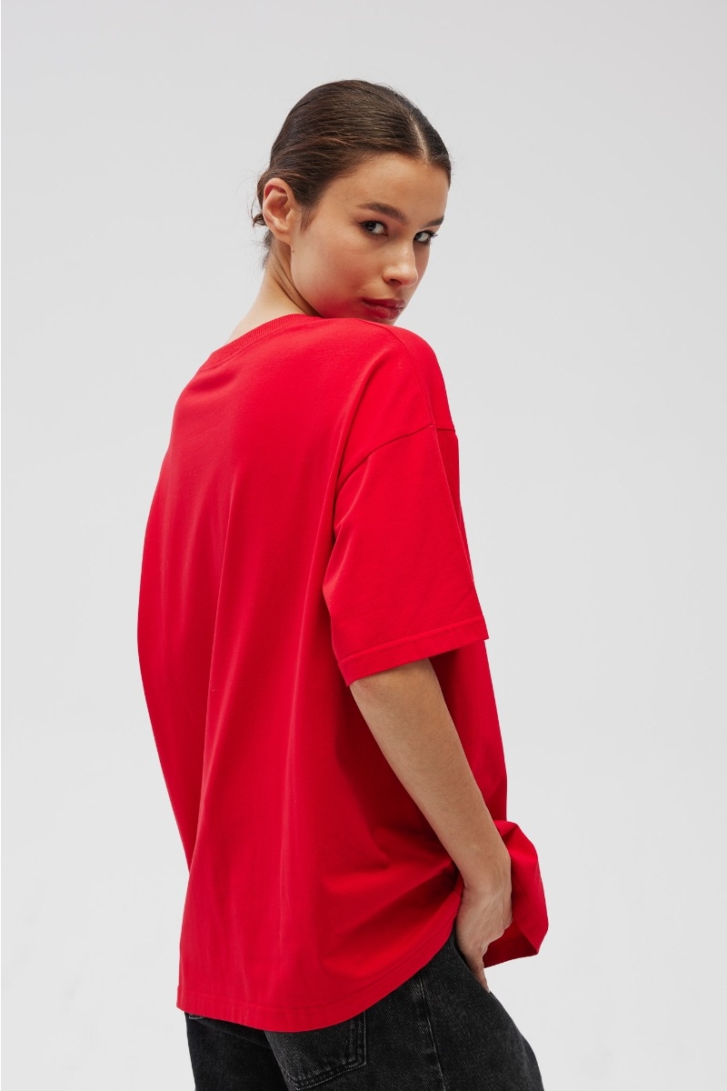Fason o prostym, pudełkowym kroju. Rękaw szeroki, dekolt niewielki, okrągły wykończony ściągaczem. Luźna, inspirowana męską garderobą koszulka, która pasuje niemalże do każdego typu sylwetki - świetnie tuszuje wszelkie niedoskonałości i daje możliwość noszenia zarówno w luźnej formie, jak i delikatnie wpuszczonej do spodni, czy spodenek. Gwarantuje komfort i stylowy wygląd.