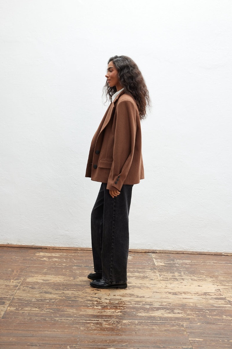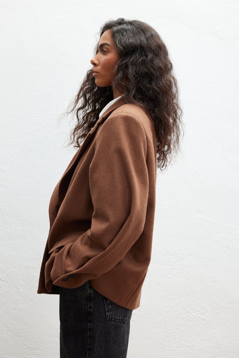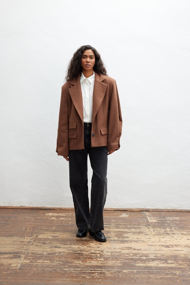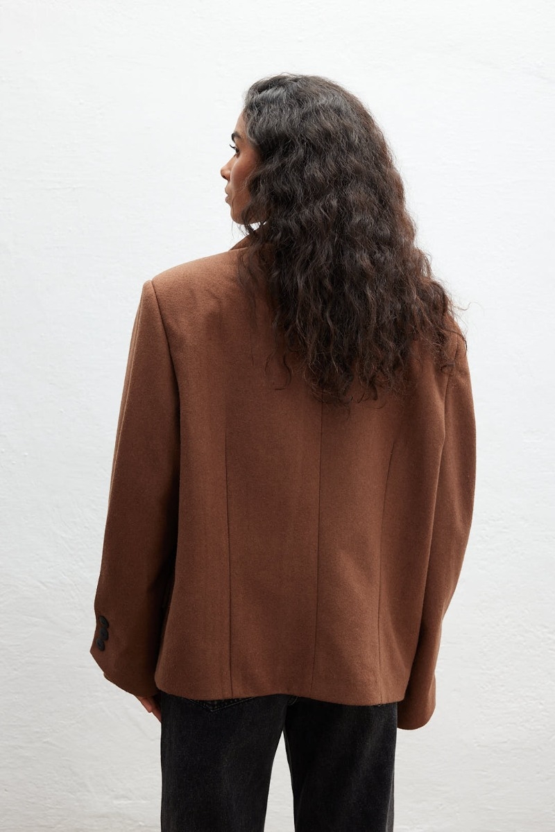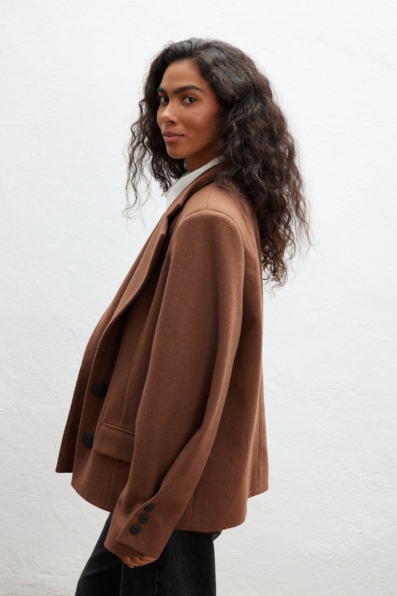 Marynarka z o prostym kroju , wykonana z wełny w kolorze camelowym.