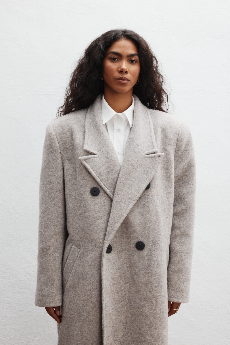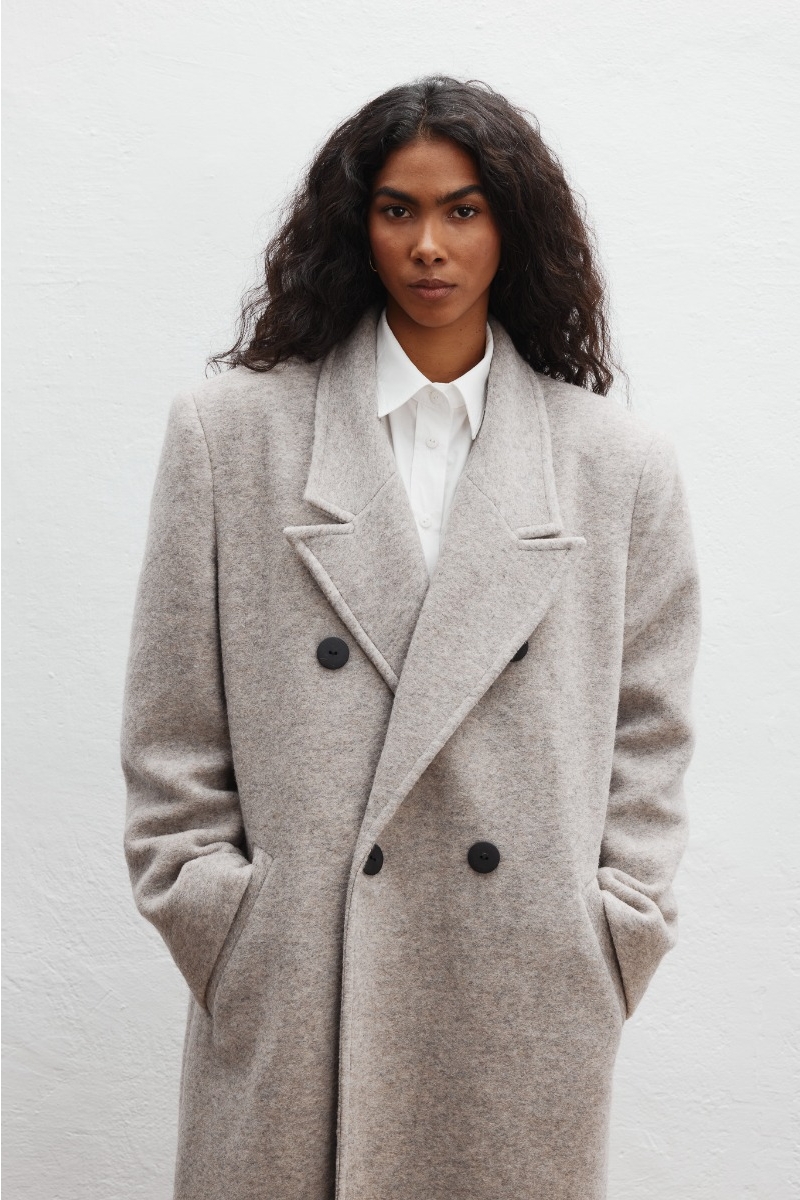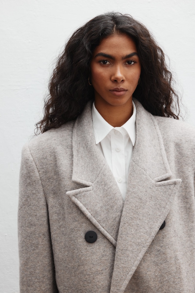 Klasyczny trencz wykonany z wełny w kolorze zimnego beżu z efektem melanżu.