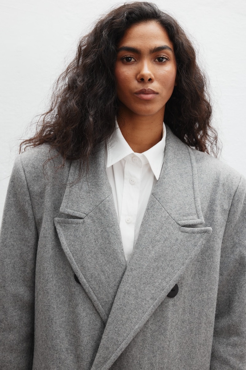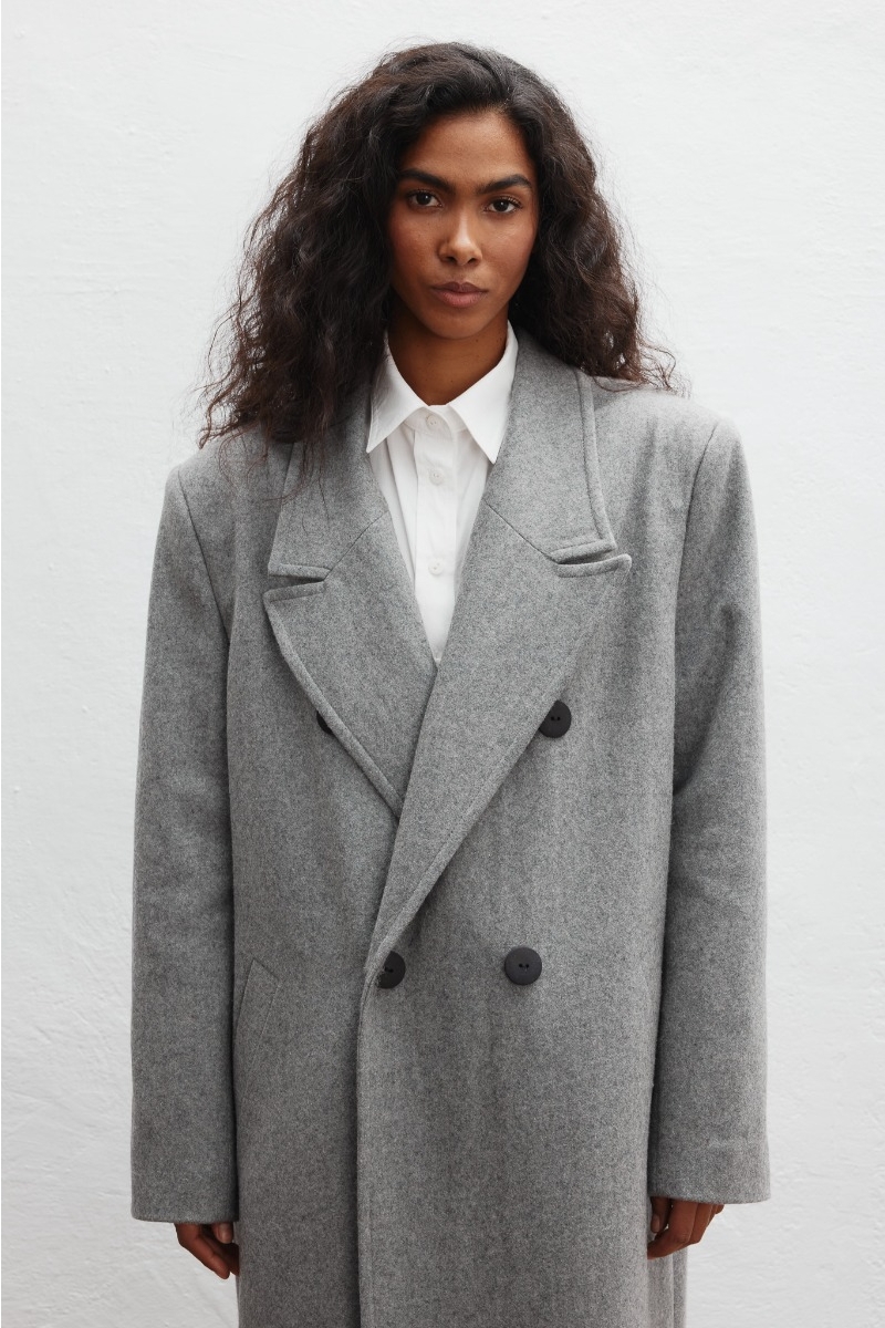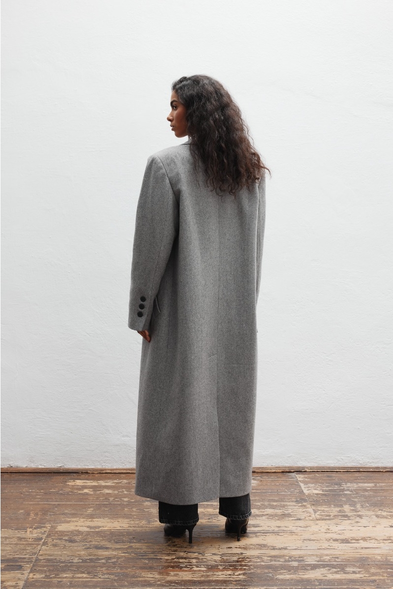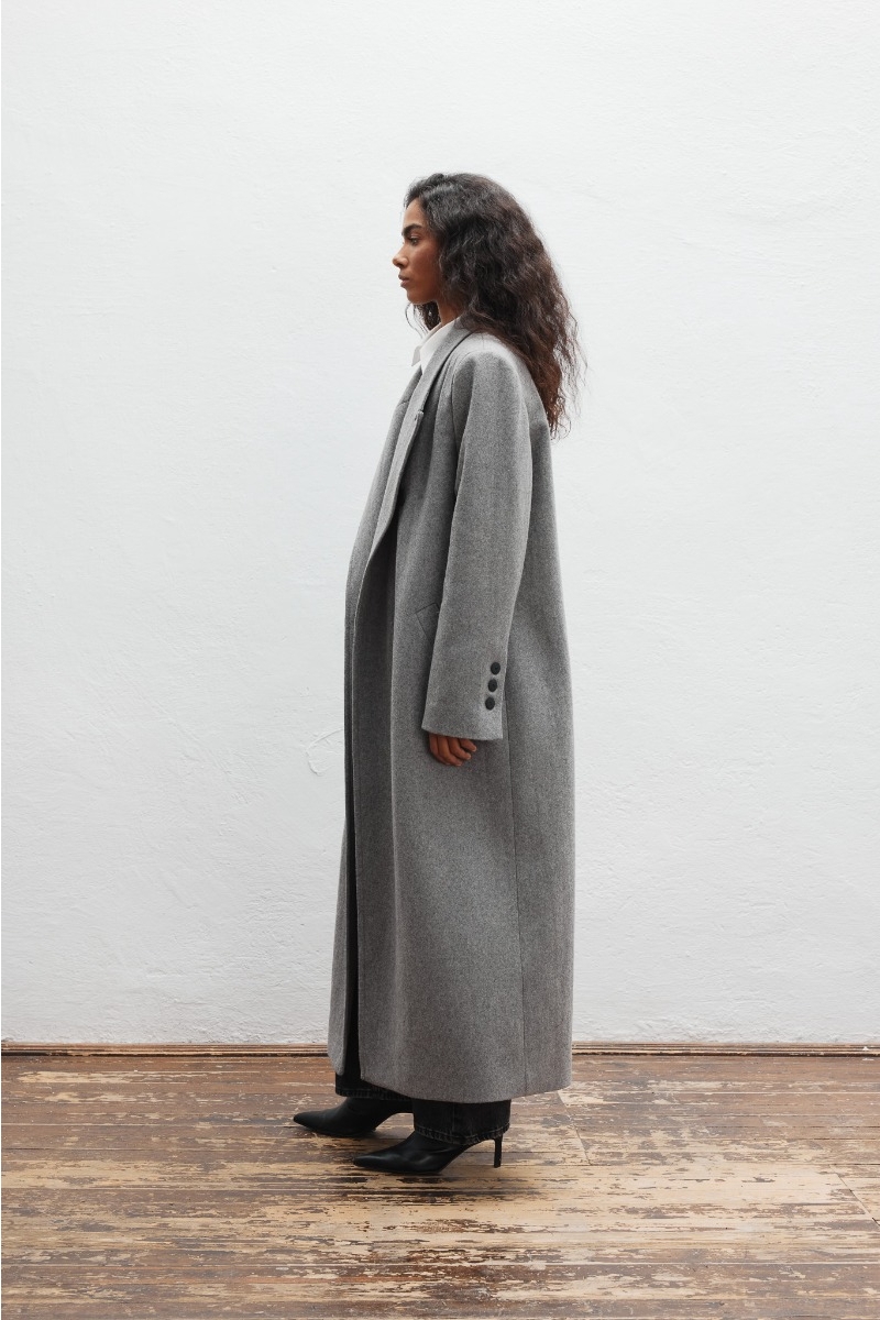 Klasyczny trencz wykonany z wełny w kolorze szarym.