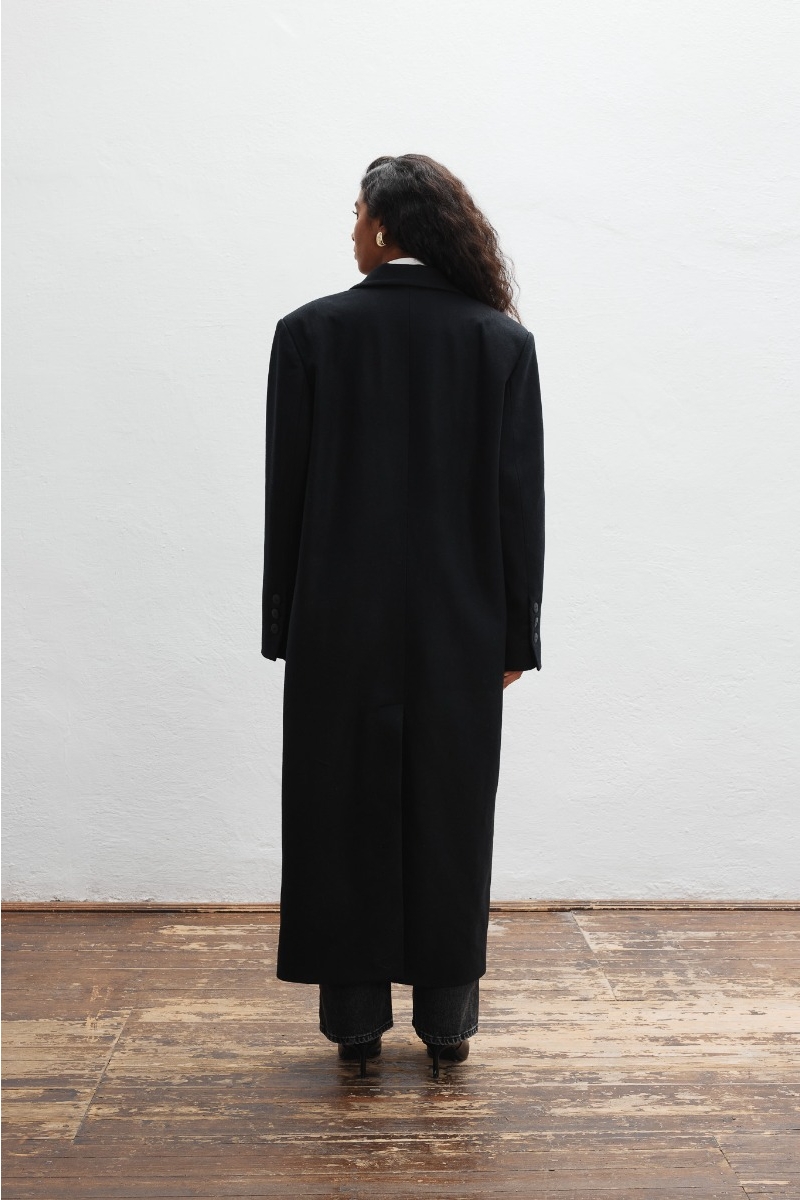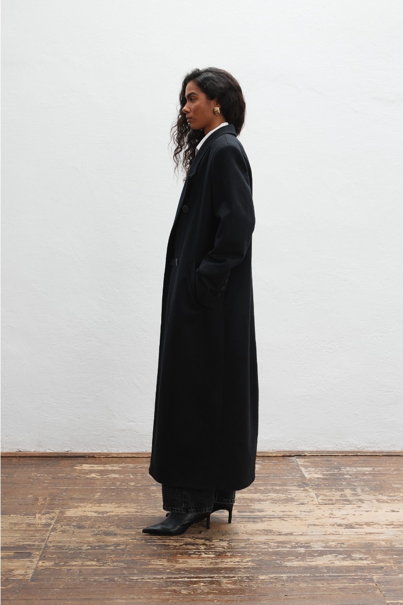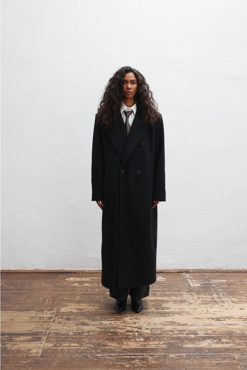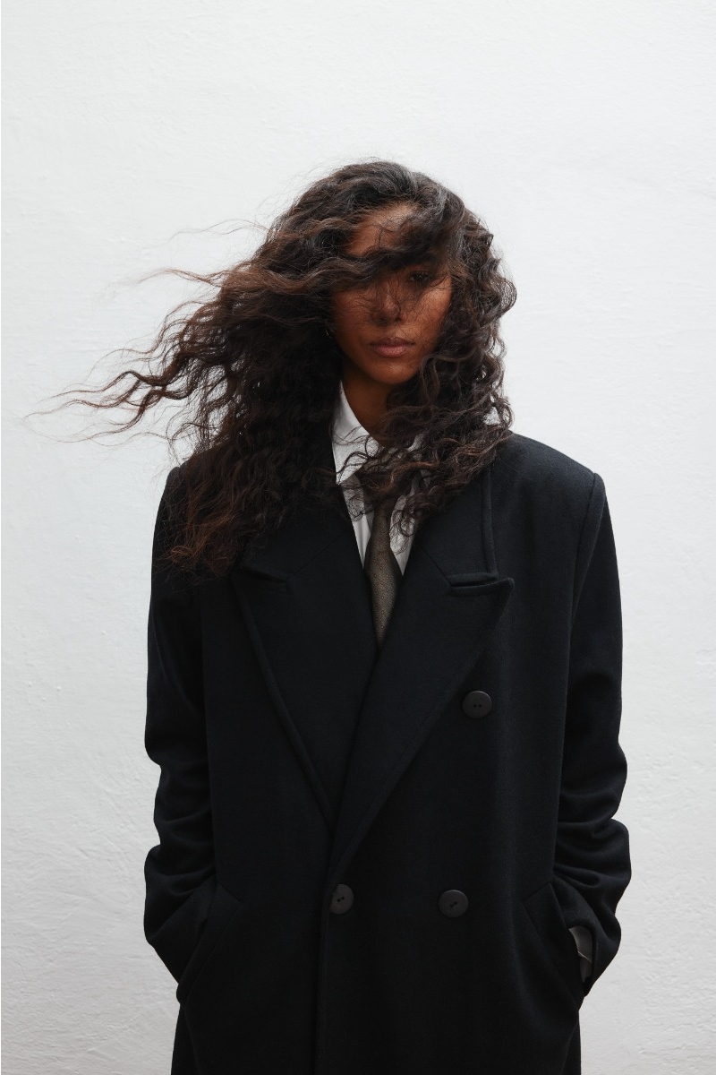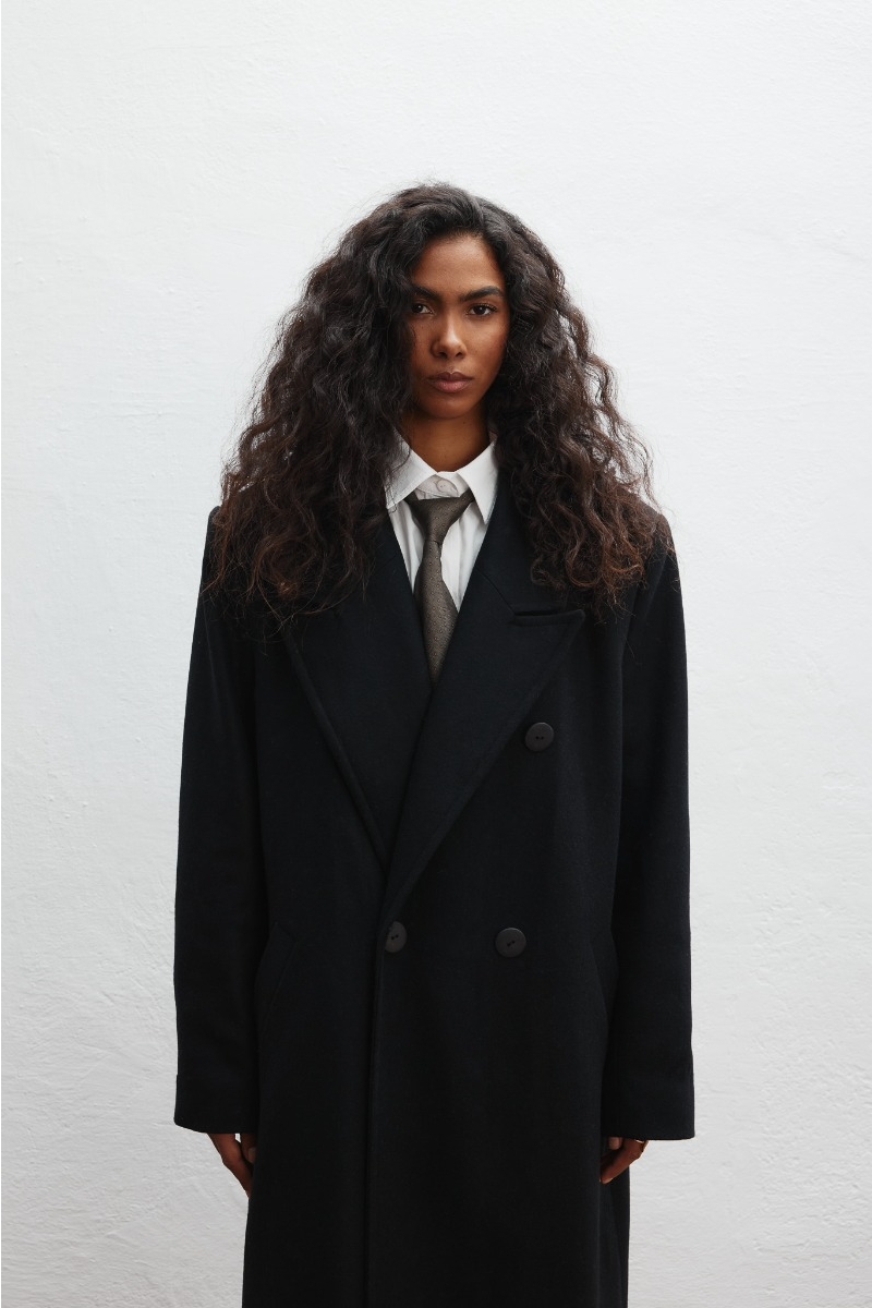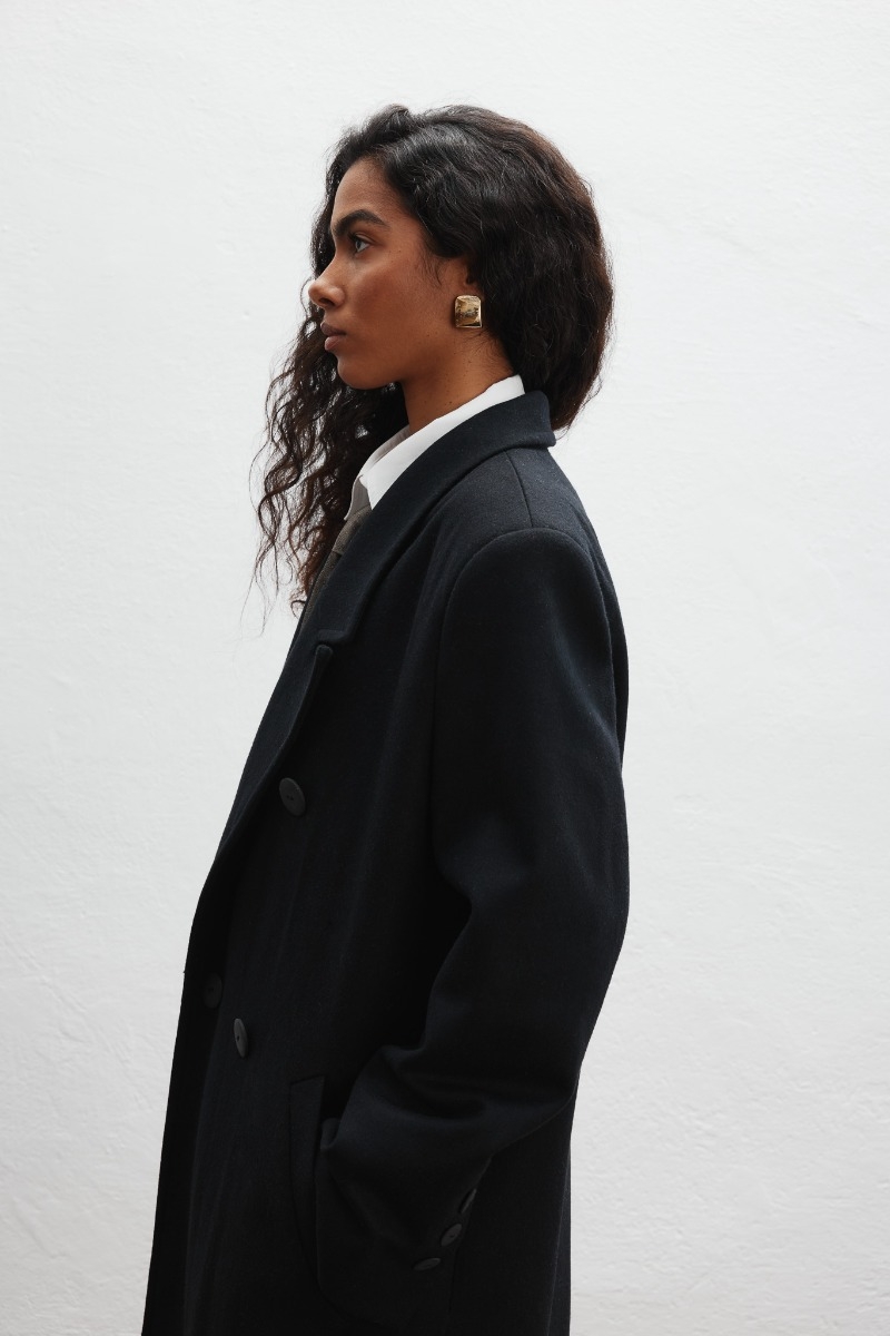Klasyczny trencz wykonany z wełny w kolorze czarnym.