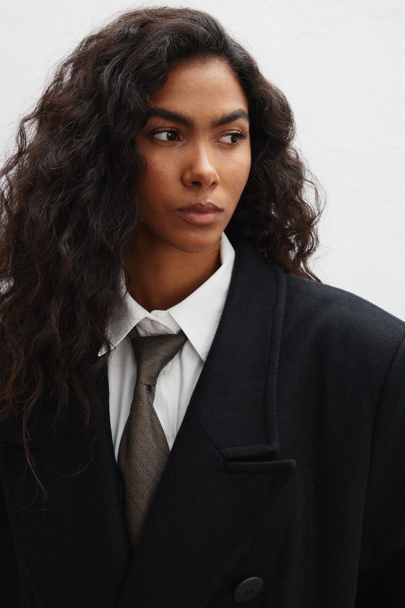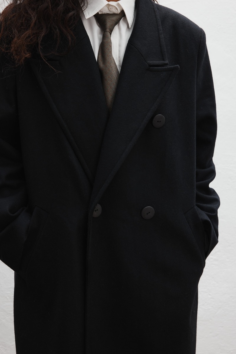 Model z klasycznym kołnierzem oraz klapami. Zapinany na dwurzędowe guziki, po bokach dwie kieszenie. Mankiety z niewielkimi guzikami. Tył gładki z klasycznym rozcięciem. Wnętrze wykończone czarną podszewką. Wełna w uzytej tkaninie doskonale reguluje temperaturę ciała, zapewniając komfort zarówno w chłodne, jak i cieplejsze dni. Jest oddychająca, odporna na zabrudzenia i w naturalny sposób odpycha wilgoć. Dodatkową zaletą wełny jest jej sprężystość – trencz nie gniecie się łatwo i długo zachowuje swój kształt. To włókno biodegradowalne i przyjazne dla środowiska, co czyni je świadomym wyborem dla osób ceniących jakość i odpowiedzialność.